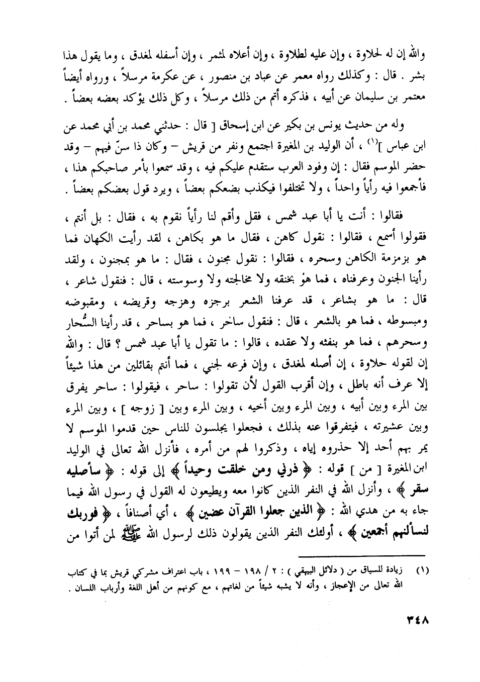 فقالوا: أنت يا أبا عبد شمس، فقل وأقم لنا رأيا نقوم به، فقال: بل أنتم، فقولوا أسمع، فقالوا: نقول كاهن، فقال ما هو بكاهن، لقد رأيت الكهان فما هو بزمزمة الكاهن وسحره، فقالوا: نقول مجنون، فقال: ما هو بمجنون، ولقد رأينا الجنون وعرفناه، فما هو بخنقه ولا مخالجته ولا وسوسته، قال: فنقول شاعر، قال: ما هو بشاعر، قد عرفنا الشعر برجزه وهزجه وقريضه، ومقبوضة ومبسوطه، فما هو بالشعر، قال: فنقول ساحر، فما هو بساحر، قد رأينا السّحار وسحرهم، فما هو بنفثه ولا عقده، قالوا: ما تقول يا أبا عبد شمس؟ قال: واللَّه إن لقوله حلاوة، إن أصله لمغدق، وإن فرعه لجني، فما أنتم بقائلين من هذا شيئا إلا عرف أنه باطل، وإن أقرب القول لأن تقولوا: ساحر، فيقولوا: ساحر يفرق بين المرء وبين أبيه، وبين المرء وبين أخيه، وبين المرء وبين [زوجه] ، وبين المرء وبين عشيرته، فيتفرقوا عنه بذلك، فجعلوا يجلسون للناس حين قدموا الموسم لا يمر بهم أحد إلا حذروه إياه، وذكروا لهم من أمره، فأنزل اللَّه تعالى في الوليد ابن المغيرة [من] قوله: ذَرْنِي وَمَنْ خَلَقْتُ وَحِيداً إلى قوله: سَأُصْلِيهِ سَقَرَ، وأنزل اللَّه في النفر الذين كانوا معه ويطيعون له القول في رسول اللَّه فيما جاء به من هدي اللَّه: الَّذِينَ جَعَلُوا الْقُرْآنَ عِضِينَ، أي أصنافا، فَوَ رَبِّكَ لَنَسْئَلَنَّهُمْ أَجْمَعِينَ، أولئك النفر الذين يقولون ذلك لرسول اللَّه صلّى اللَّه عليه وسلم لمن أتوا من