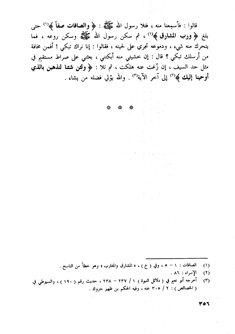 قالوا: فأسمعنا منه، فتلا رسول اللَّه صلّى اللَّه عليه وسلم: وَالصَّافَّاتِ صَفًّا [ (1) ] حتى بلغ وَرَبُّ الْمَشارِقِ [ (1) ] ، ثم سكن رسول اللَّه صلّى اللَّه عليه وسلم وسكن روعه، فما يتحرك منه شيء، ودموعه تجري على لحيته، فقالوا: إنا نراك تبكي! أفمن مخافة من أرسلك تبكي؟ قال: إن خشيتي منه أبكتني، بعثني على صراط مستقيم في مثل حد السيف، إن زغت عنه هلكت، ثم تلا: وَلَئِنْ شِئْنا لَنَذْهَبَنَّ بِالَّذِي أَوْحَيْنا إِلَيْكَ [ (2) ] إلى آخر الآية [ (3) ] . واللَّه يؤتي فضله من يشاء.