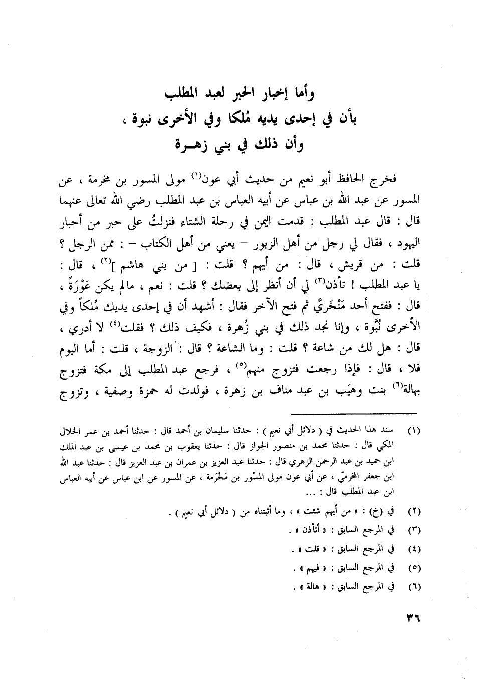 [ (1) ] سند هذا الحديث في (دلائل أبي نعيم) : حدثنا سليمان بن أحمد قال: حدثنا أحمد بن عمر الخلال المكيّ قال: حدثنا محمد بن منصور الجواز قال: حدثنا يعقوب بن محمد بن عيسى بن عبد الملك ابن حميد بن عبد الرحمن الزهري قال: حدثنا عبد العزيز بن عمران بن عبد العزيز قال: حدثنا عبد اللَّه ابن جعفر المخرميّ، عن أبي عون مولى المسور بن مخرمة، عن المسور عن ابن عباس عن أبيه العباس ابن عبد المطلب قال: ...
