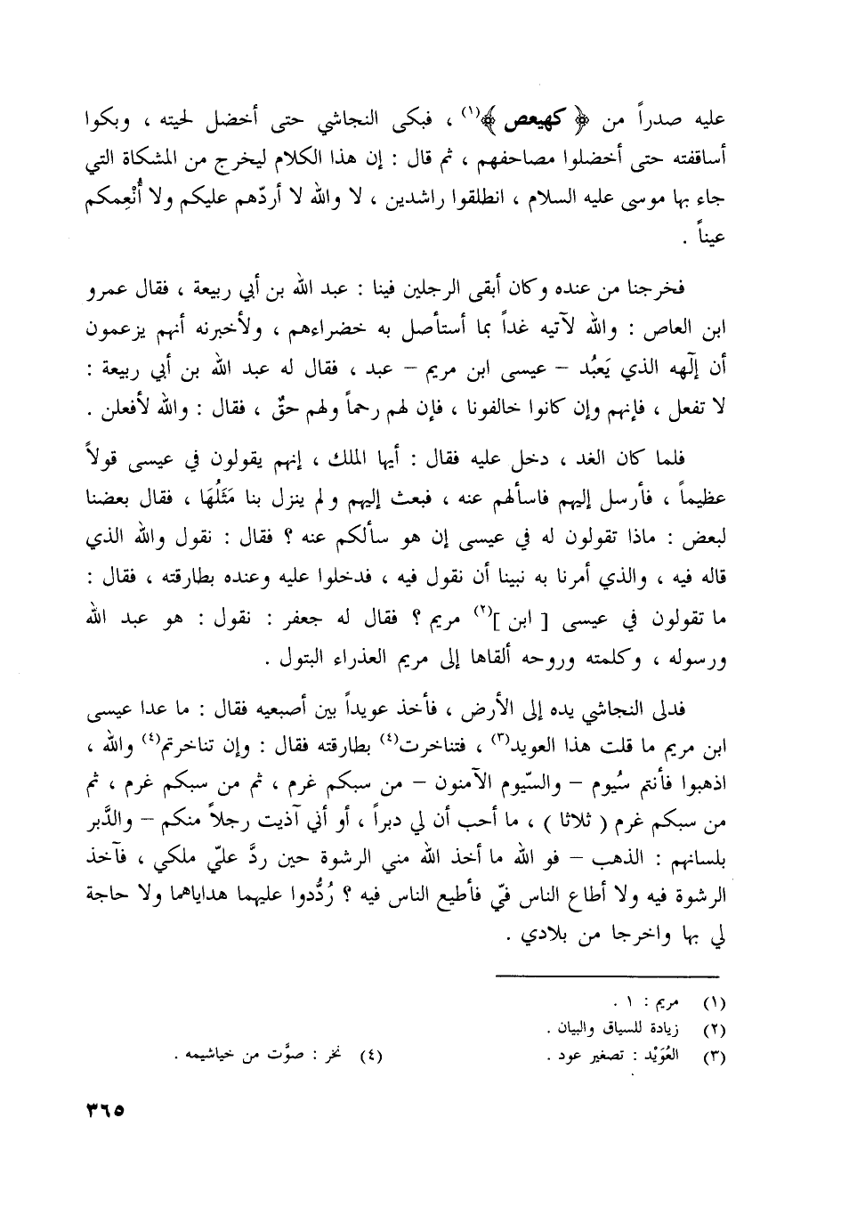 عليه صدرا من كهيعص [ (1) ] ، فبكى النجاشي حتى أخضل لحيته، وبكوا أساقفته حتى أخضلوا مصاحفهم، ثم قال: إن هذا الكلام ليخرج من المشكاة التي جاء بها موسى عليه السلام، انطلقوا راشدين، لا واللَّه لا أردّهم عليكم ولا أنعمكم عينا.