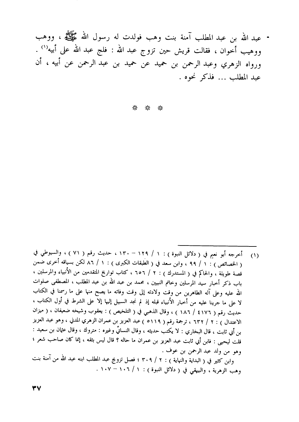 وابن كثير في (البداية والنهاية) : 2/ 309، فصل تزويج عبد المطلب ابنه عبد اللَّه من آمنة بنت وهب الزهرية، والبيهقي في (دلائل النبوة) : 1/ 106- 107.