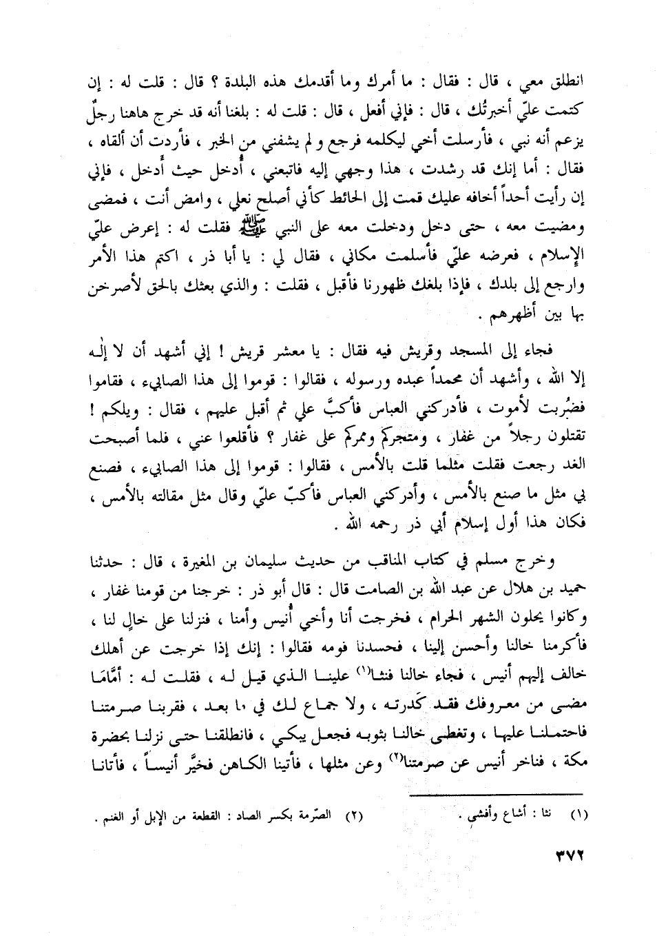 وخرج مسلم في كتاب المناقب من حديث سليمان بن المغيرة، قال: حدثنا حميد بن هلال عن عبد اللَّه بن الصامت قال: قال أبو ذر: خرجنا من قومنا غفار، وكانوا يحلون الشهر الحرام، فخرجت أنا وأخي أنيس وأمنا، فنزلنا على خال لنا، فأكرمنا خالنا وأحسن إلينا، فحسدنا قومه فقالوا: إنك إذا خرجت عن أهلك خالف إليهم أنيس، فجاء خالنا فنثا [ (1) ] علينا الّذي قيل له، فقلت له: أمّا ما مضى من معروفك فقد كدرته، ولا جماع لك في ما بعد، فقربنا صرمتنا فاحتملنا عليها، وتغطى خالنا بثوبه فجعل يبكي، فانطلقنا حتى نزلنا بحضرة مكة، فناخر أنيس عن صرمتنا [ (2) ] وعن مثلها، فأتينا الكاهن فخيّر أنيسا، فأتانا
