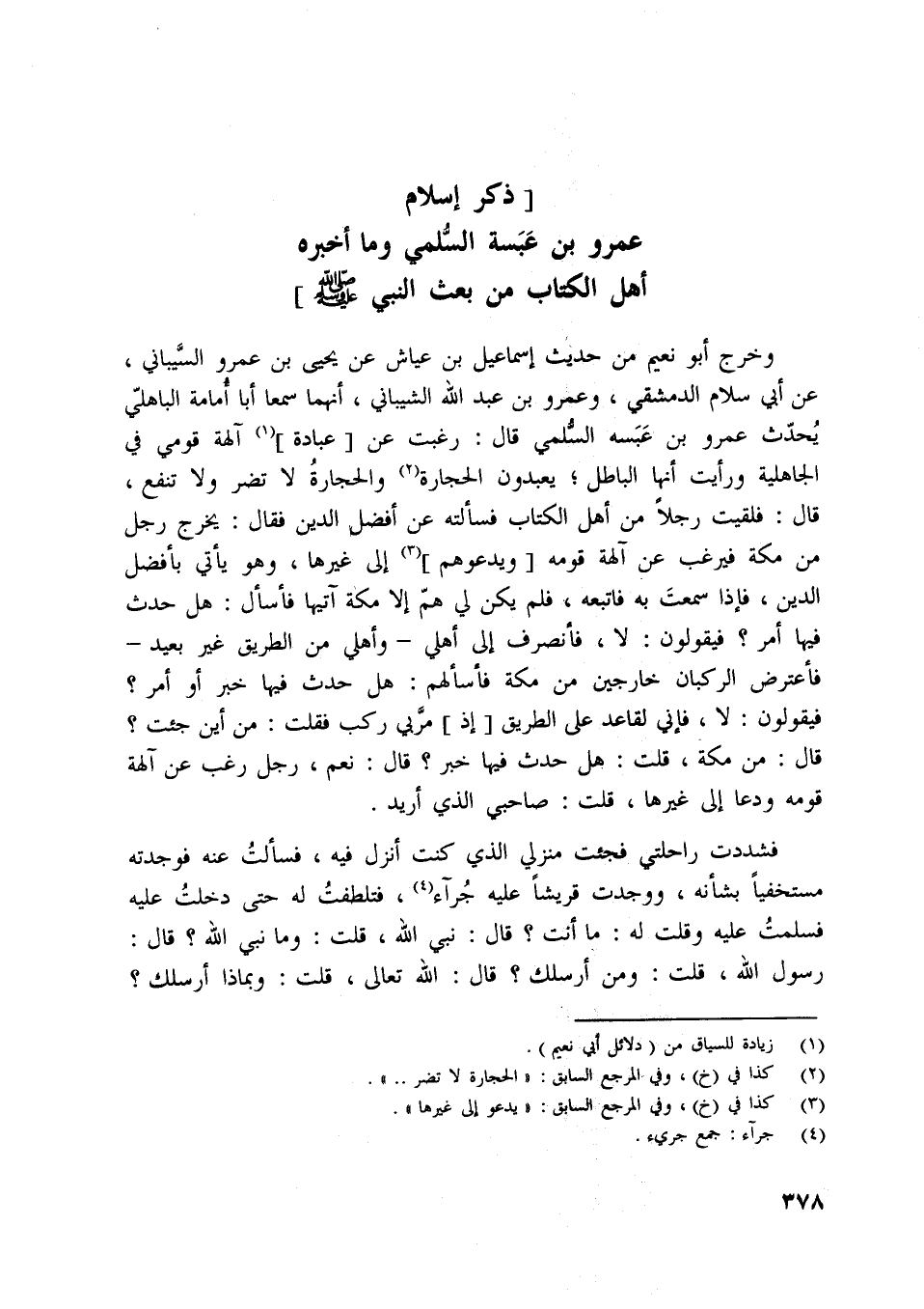 وخرج أبو نعيم من حديث إسماعيل بن عياش عن يحيى بن عمرو السّيباني، عن أبي سلام الدمشقيّ، وعمرو بن عبد اللَّه الشيبانيّ، أنهما سمعا أبا أمامة الباهليّ يحدّث عمرو بن عبسه السّلمي قال: رغبت عن [عبادة] [ (1) ] آلهة قومي في الجاهلية ورأيت أنها الباطل، يعبدون الحجارة [ (2) ] والحجارة لا تضر ولا تنفع، قال: فلقيت رجلا من أهل الكتاب فسألته عن أفضل الدين فقال: يخرج رجل من مكة فيرغب عن آلهة قومه [ويدعوهم] [ (3) ] إلى غيرها، وهو يأتي بأفضل الدين، فإذا سمعت به فاتبعه، فلم يكن لي همّ إلا مكة آتيها فأسأل: هل حدث فيها أمر؟ فيقولون: لا، فأنصرف إلى أهلي- وأهلي من الطريق غير بعيد- فأعترض الركبان خارجين من مكة فأسألهم: هل حدث فيها خبر أو أمر؟