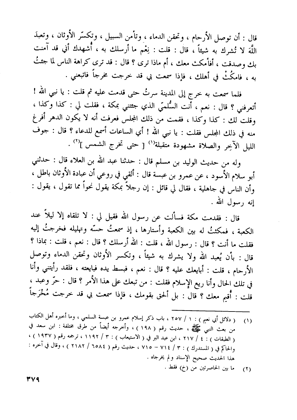 [ (1) ] (دلائل أبي نعيم) : 1/ 257، باب ذكر إسلام عمرو بن عبسة السلمي، وما أخبره أهل الكتاب من بعث النبي صلّى اللَّه عليه وسلم، حديث رقم (198) ، وأخرجه أيضا من طرق مختلفة: ابن سعد في (الطبقات) : 4/ 217، ابن عبد البر في (الاستيعاب) : 3/ 1192، ترجمة رقم (1937) ، والحاكم في (المستدرك) : 3/ 714- 715، حديث رقم (6584/ 2182) ، وقال في آخره: