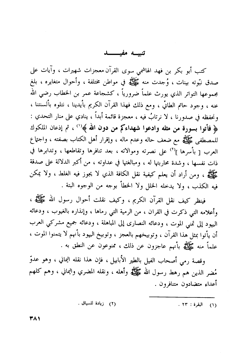 فَأْتُوا بِسُورَةٍ مِنْ مِثْلِهِ وَادْعُوا شُهَداءَكُمْ مِنْ دُونِ اللَّهِ [ (1) ] ، ثم إذعان الملوك للمصطفى صلّى اللَّه عليه وسلم مع ضعف حاله وعدم ماله، وإقرار أهل الكتاب بصفته، واجتماع العرب [بأسرها] [ (2) ] على نصرته وموالاته، بعد تنافرها وتقاطعها، وتدابرها في ذات نفسها، وشدة محاربتها له، ومبالغتها في عداوته، من أكبر الدلالة على صدقة صلّى اللَّه عليه وسلم، ومن أراد أن يعلم كيفية نقل الكافة الّذي لا يجوز فيه الغلط، ولا يمكن فيه الكذب، ولا يدخله الخلل ولا الخطأ بوجه من الوجوه البتة.