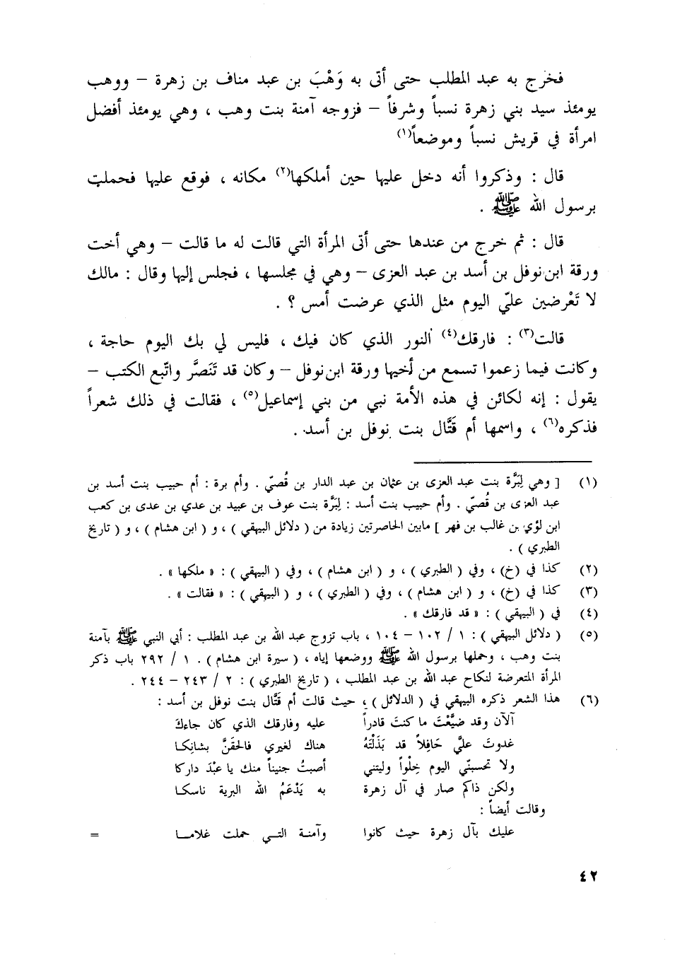 [ (5) ] (دلائل البيهقي) : 1/ 102- 104، باب تزوج عبد اللَّه بن عبد المطلب: أبي النبي صلّى اللَّه عليه وسلم بآمنة بنت وهب، وحملها برسول اللَّه صلّى اللَّه عليه وسلم ووضعها إياه، (سيرة ابن هشام) . 1/ 292 باب ذكر المرأة المتعرضة لنكاح عبد اللَّه بن عبد المطلب، (تاريخ الطبري) : 2/ 243- 244.