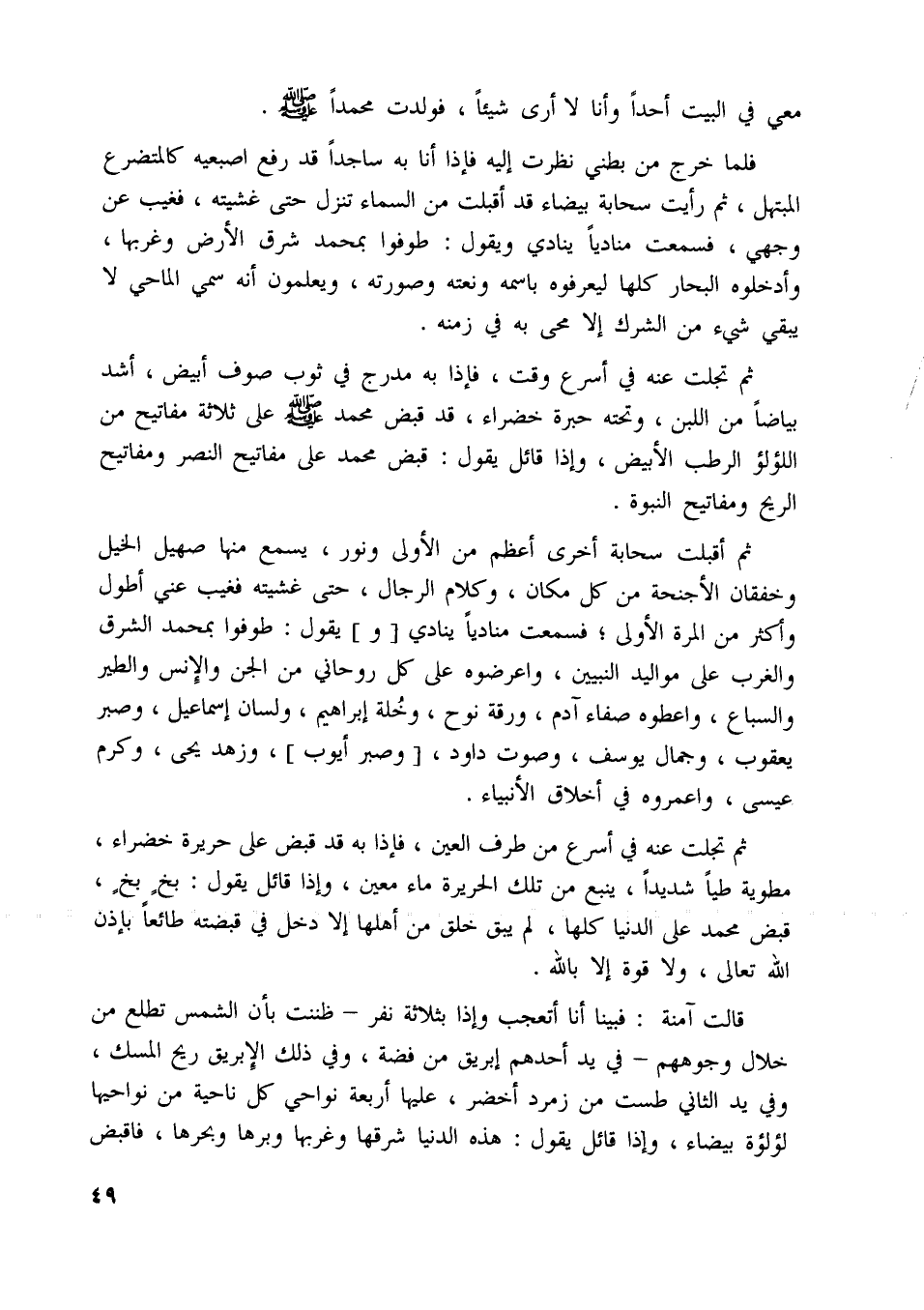 فلما خرج من بطني نظرت إليه فإذا أنا به ساجدا قد رفع إصبعيه كالمتضرع المبتهل، ثم رأيت سحابة بيضاء قد أقبلت من السماء تنزل حتى غشيته، فغيب عن وجهي، فسمعت مناديا ينادي ويقول: طوفوا بمحمد شرق الأرض وغربها، وأدخلوه البحار كلها ليعرفوه باسمه ونعته وصورته، ويعلمون أنه سمي الماحي لا يبقى شيء من الشرك إلا محي به في زمنه.
