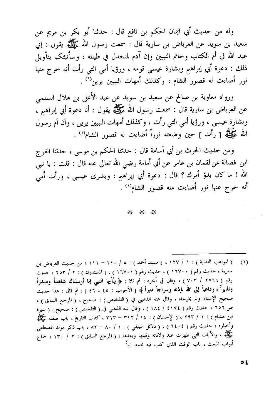 ورواه معاوية بن صالح عن سعيد بن سويد عن عبد الأعلى بن هلال السلمي عن العرباض بن سارية قال: سمعت رسول اللَّه صلّى اللَّه عليه وسلم يقول: أنا دعوة أبي إبراهيم، وبشارة عيسى، ورؤيا أمي التي رأت، وكذلك أمهات النبيين يرين، وأن أم رسول اللَّه صلّى اللَّه عليه وسلم [رأت] حين وضعته نورا أضاءت له قصور الشام [ (1) ] .