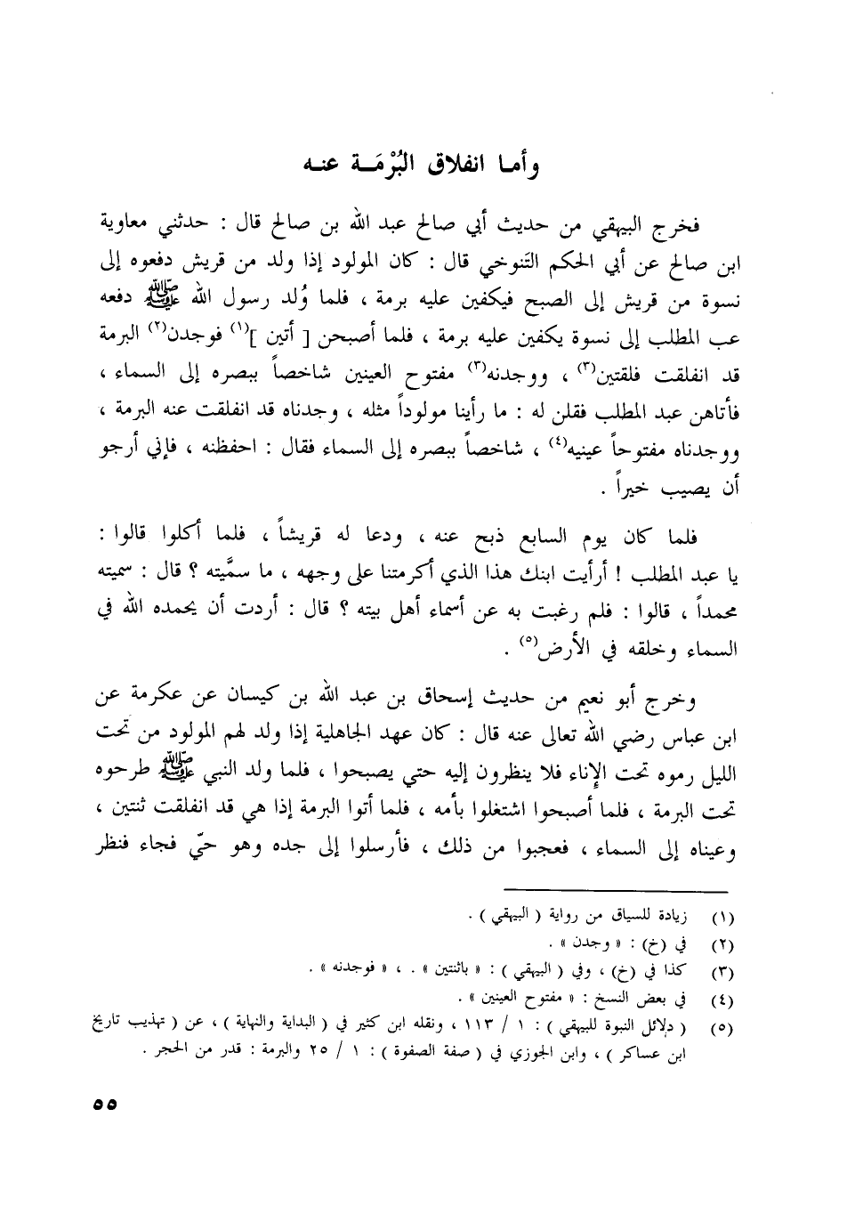 فخرج البيهقي من حديث أبي صالح عبد اللَّه بن صالح قال: حدثني معاوية ابن صالح عن أبي الحكم التنوخي قال: كان المولود إذا ولد من قريش دفعوه إلى نسوة من قريش إلى الصبح فيكفين عليه برمة، فلما ولد رسول اللَّه صلّى اللَّه عليه وسلم دفعه عبد المطلب إلى نسوة يكفين عليه برمة، فلما أصبحن [أتين] [ (1) ] فوجدن [ (2) ] البرمة قد انفلقت فلقتين [ (3) ] ، ووجدنه [ (3) ] مفتوح العينين شاخصا ببصره إلى السماء، فأتاهن عبد المطلب فقلن له: ما رأينا مولودا مثله، وجدناه قد انفلقت عنه البرمة، ووجدناه مفتوحا عينيه [ (4) ] ، شاخصا ببصره إلى السماء فقال: احفظنه، فإنّي أرجو أن يصيب خيرا.