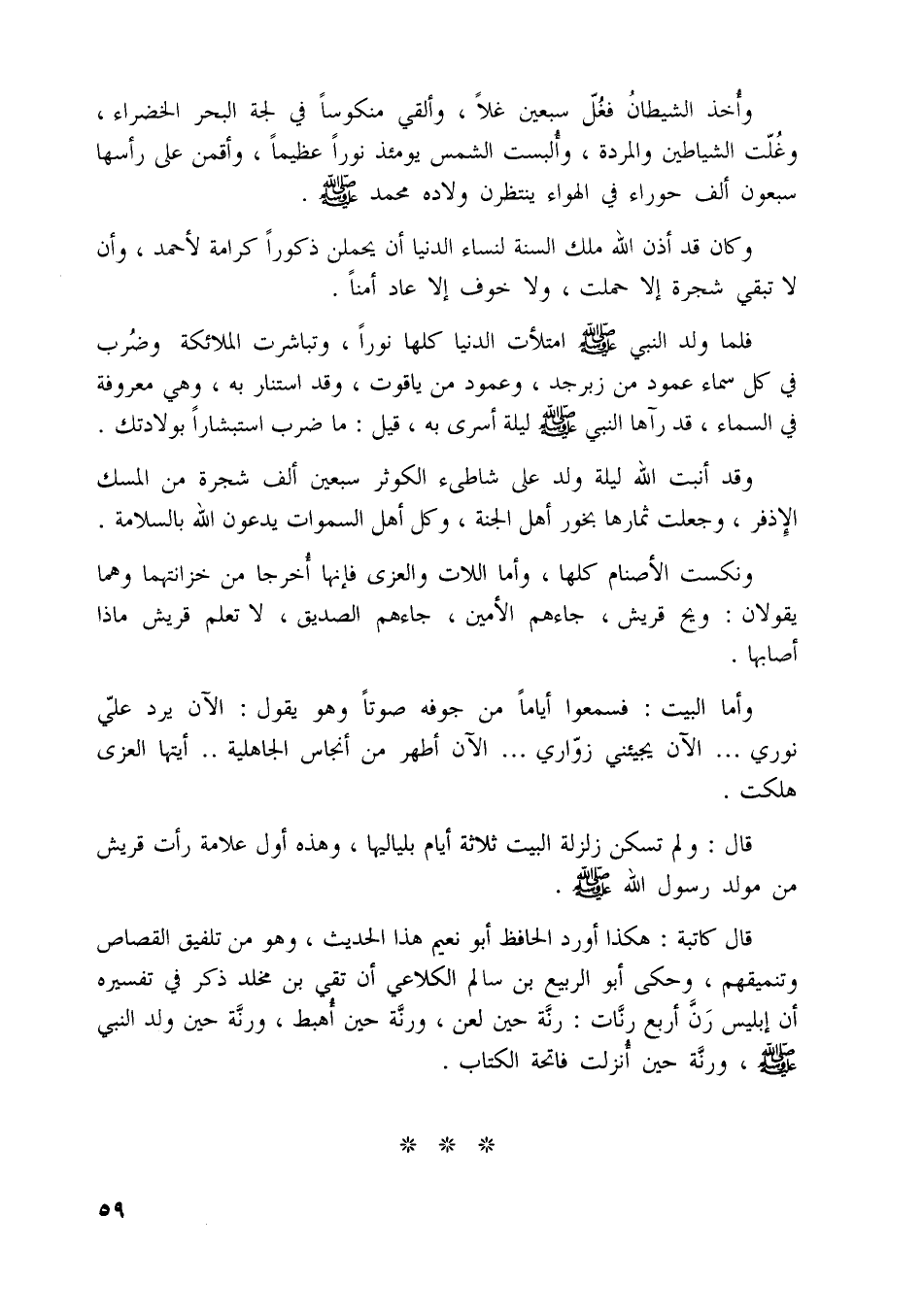 فلما ولد النبي صلّى اللَّه عليه وسلم امتلأت الدنيا كلها نورا، وتباشرت الملائكة وضرب في كل سماء عمود من زبرجد، وعمود من ياقوت، وقد استنار به، وهي معروفة في السماء، قد رآها النبي صلّى اللَّه عليه وسلم ليلة أسرى به، قيل: ما ضرب استبشارا بولادتك.