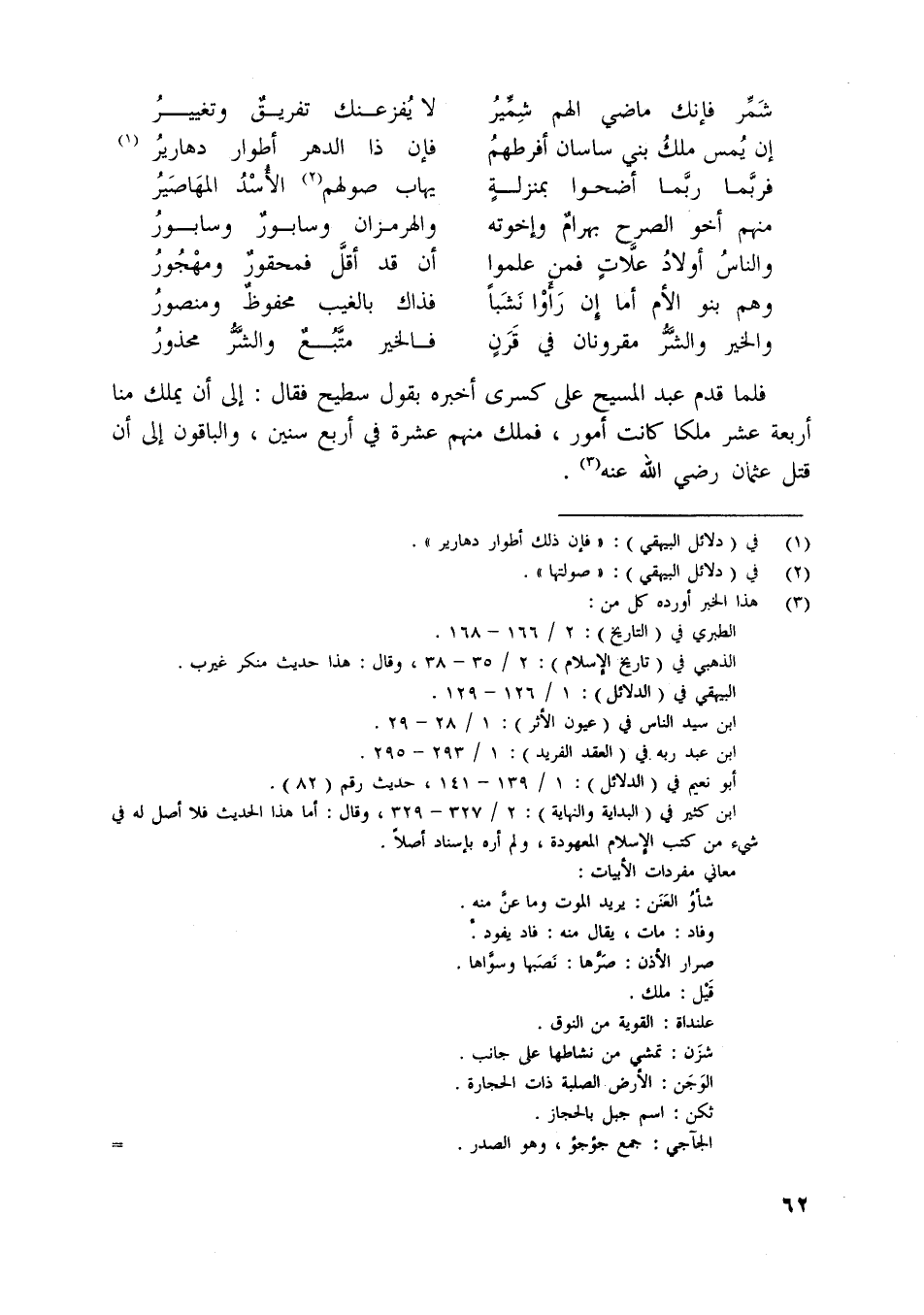 فلما قدم عبد المسيح على كسرى أخبره بقول سطيح فقال: إلى أن يملك منا أربعة عشر ملكا كانت أمور، فملك منهم عشرة في أربع سنين، والباقون إلى أن قتل عثمان رضي اللَّه عنه [ (3) ] .