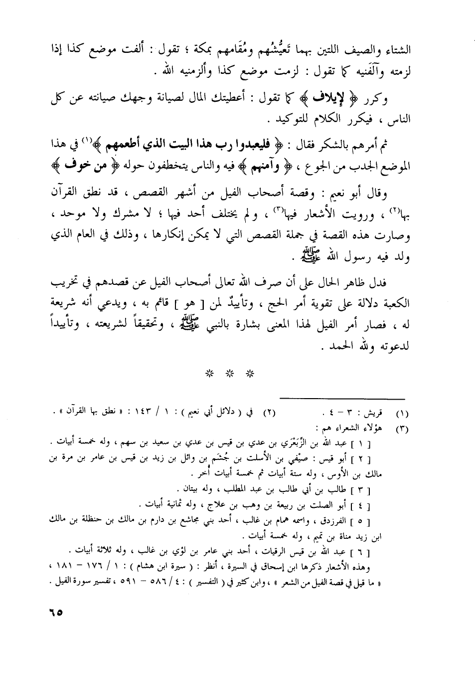 ثم أمرهم بالشكر فقال: فَلْيَعْبُدُوا رَبَّ هذَا الْبَيْتِ الَّذِي أَطْعَمَهُمْ [ (1) ] في هذا الموضع الجدب من الجوع، وَآمَنَهُمْ فيه والناس يتخطفون حوله مِنْ خَوْفٍ وقال أبو نعيم: وقصة أصحاب الفيل من أشهر القصص، قد نطق القرآن بها [ (2) ] ، ورويت الأشعار فيها [ (3) ] ، ولم يختلف أحد فيها، لا مشرك ولا موحد، وصارت هذه القصة في جملة القصص التي لا يمكن إنكارها، وذلك في العام الّذي ولد فيه رسول اللَّه صلّى اللَّه عليه وسلم.