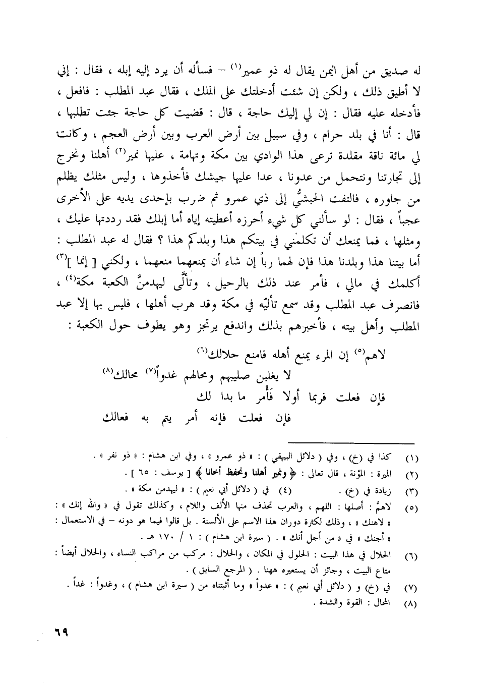 له صديق من أهل اليمن يقال له ذو عمير [ (1) ]- فسأله أن يرد إليه إبله، فقال: إني لا أطيق ذلك، ولكن إن شئت أدخلتك على الملك، فقال عبد المطلب: فافعل، فأدخله عليه فقال: إن لي إليك حاجة، قال: قضيت كل حاجة جئت تطلبها، قال: أنا في بلد حرام، وفي سبيل بين أرض العرب وبين أرض العجم، وكانت لي مائة ناقة مقلدة ترعى هذا الوادي بين مكة وتهامة، عليها نمير [ (2) ] أهلنا ونخرج إلى تجارتنا ونتحمل من عدونا، عدا عليها جيشك فأخذوها، وليس مثلك يظلم من جاوره، فالتفت الحبشيّ إلى ذي عمرو ثم ضرب بإحدى يديه على الأخرى عجبا، فقال: لو سألني كل شيء أحرزه أعطيته إياه أما إبلك فقد رددتها عليك، ومثلها، فما يمنعك أن تكلمني في بيتكم هذا وبلدكم هذا؟ فقال له عبد المطلب: