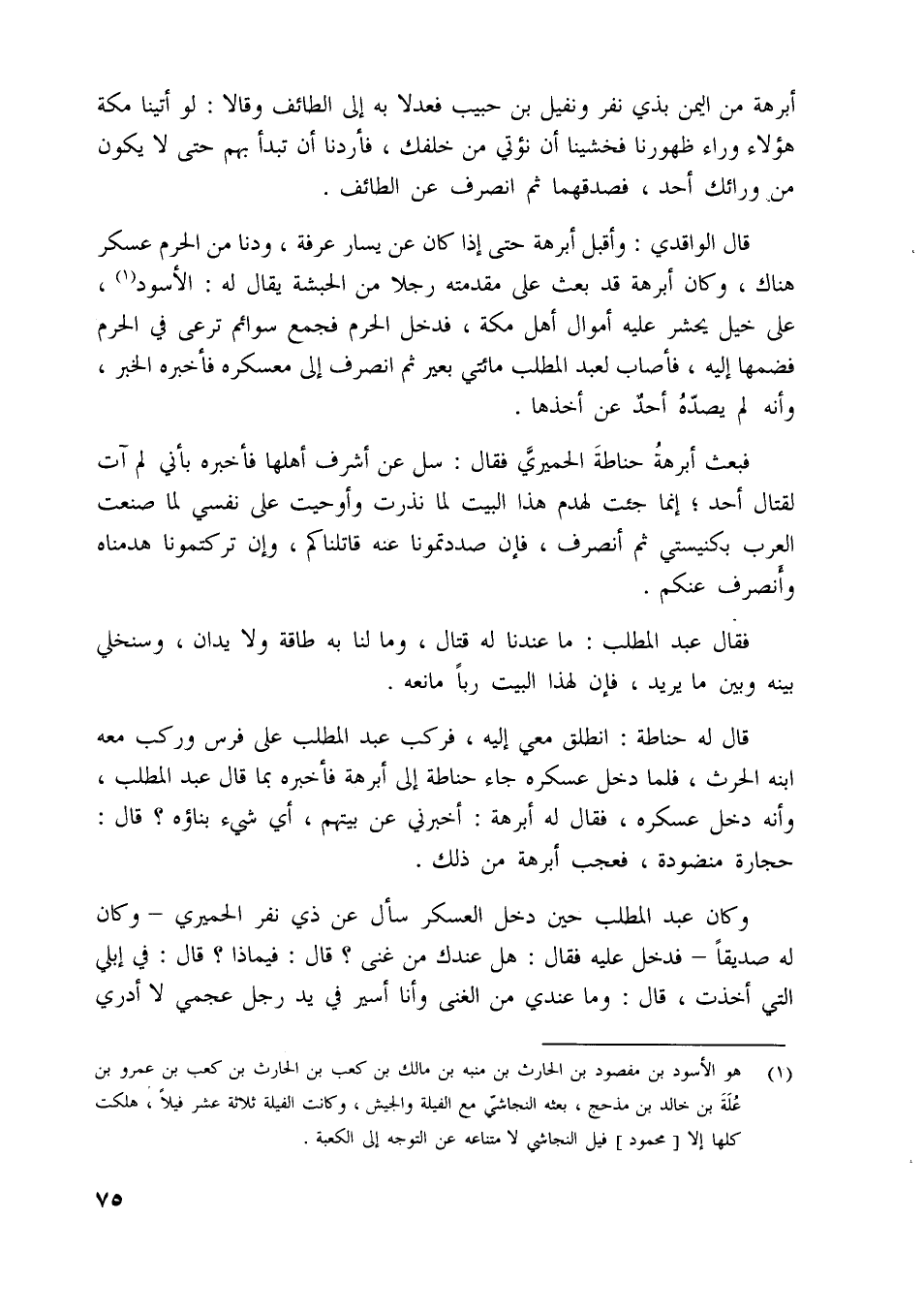 [ (1) ] هو الأسود بن مفصود بن الحارث بن منبه بن مالك بن كعب بن الحارث بن كعب بن عمرو بن علة بن خالد بن مذحج، بعثه النجاشيّ مع الفيلة والجيش، وكانت الفيلة ثلاثة عشر فيلا، هلكت كلها إلا [محمود] فيل النجاشي لامتناعه عن التوجه إلى الكعبة.