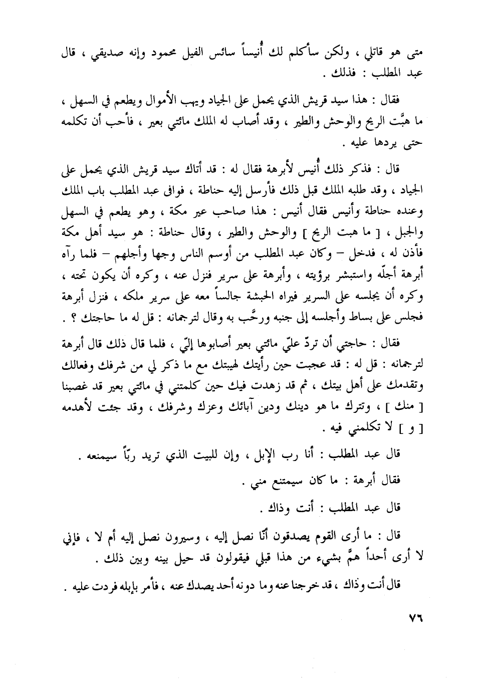 متى هو قاتلي، ولكن سأكلم لك أنيسا سائس الفيل محمود وإنه صديقي، قال عبد المطلب: فذلك.