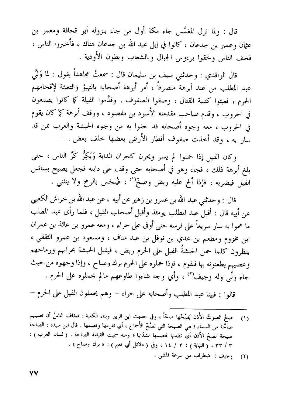 قال: وحدثني عبد اللَّه بن عمرو بن زهير عن أبيه، عن عبد اللَّه بن خراش الكعبي عن أبيه قال: أقبل عبد المطلب يومئذ وأقبل أصحاب الفيل، فلما رأى عبد المطلب ما هموا به سار سريعا على فرسه حتى أوفى على حراء، ومعه عمرو بن عائذ بن عمران ابن مخزوم ومطعم بن عدي بن نوفل بن عبد مناف، ومسعود بن عمرو الثقفي، ينظرون كلما حمل الحبشة الفيل على الحرم ربض، فيقبل الحبشة بحرابهم ورماحهم وعصيهم يطعنونه بها فيقوم، فإذا حملوه على الحرم برك وصاح، وإذا وجهوه من حيث جاء ولّى وله وجيف [ (2) ] ، وأي وجه شاءوا طاوعهم ما لم يحملوه على الحرم.