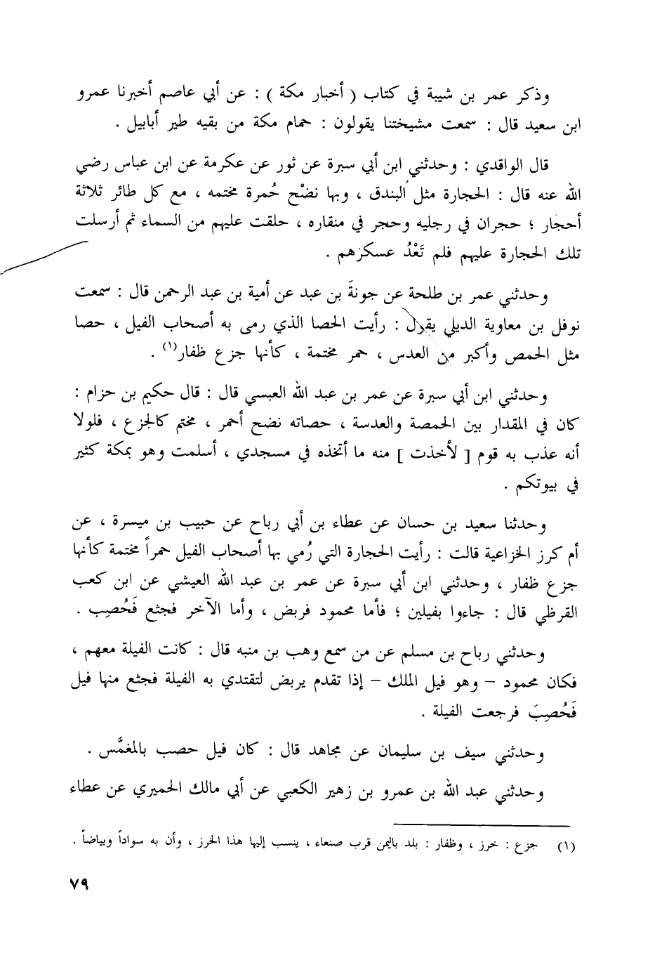 وحدثنا سعيد بن حسان عن عطاء بن أبي رباح عن حبيب بن ميسرة، عن أم كرز الخزاعية قالت: رأيت الحجارة التي رمي بها أصحاب الفيل حمرا مختمة كأنها جزع ظفار، وحدثني ابن أبي سبرة عن عمر بن عبد اللَّه العيشي عن ابن كعب القرظي قال: جاءوا بفيلين، فأما محمود فربض، وأما الآخر فجثع فحصب.