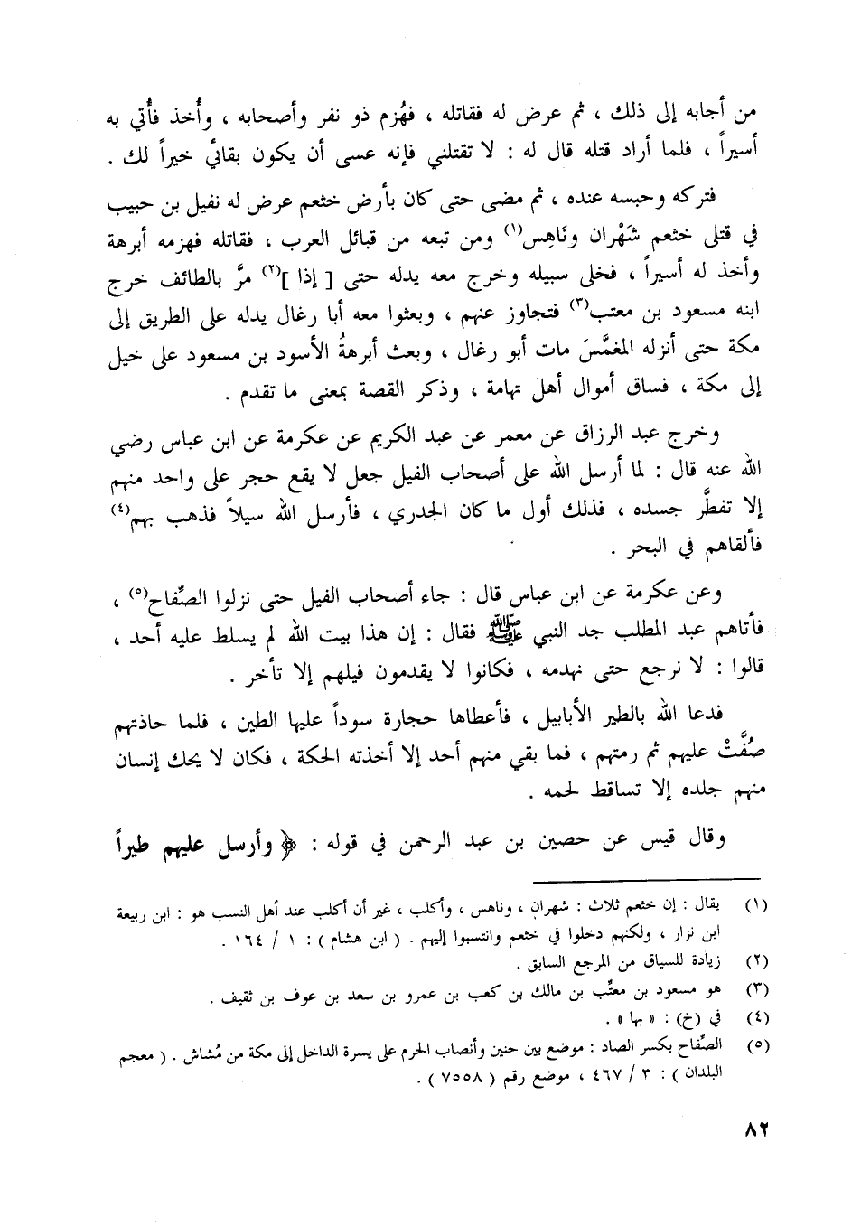 فتركه وحبسه عنده، ثم مضى حتى كان بأرض خثعم عرض له نفيل بن حبيب في قتلى خثعم شهران وناهس [ (1) ] ومن تبعه من قبائل العرب، فقاتله فهزمه أبرهة وأخذ له أسيرا، فخلى سبيله وخرج معه يدله حتى [إذا] [ (2) ] مرّ بالطائف خرج ابنه مسعود بن معتب [ (3) ] فتجاوز عنهم، وبعثوا معه أبا رغال يدله على الطريق إلى مكة حتى أنزله المغمّس مات أبو رغال، وبعث أبرهة الأسود بن مسعود على خيل إلى مكة، فساق أموال أهل تهامة، وذكر القصة بمعنى ما تقدم.