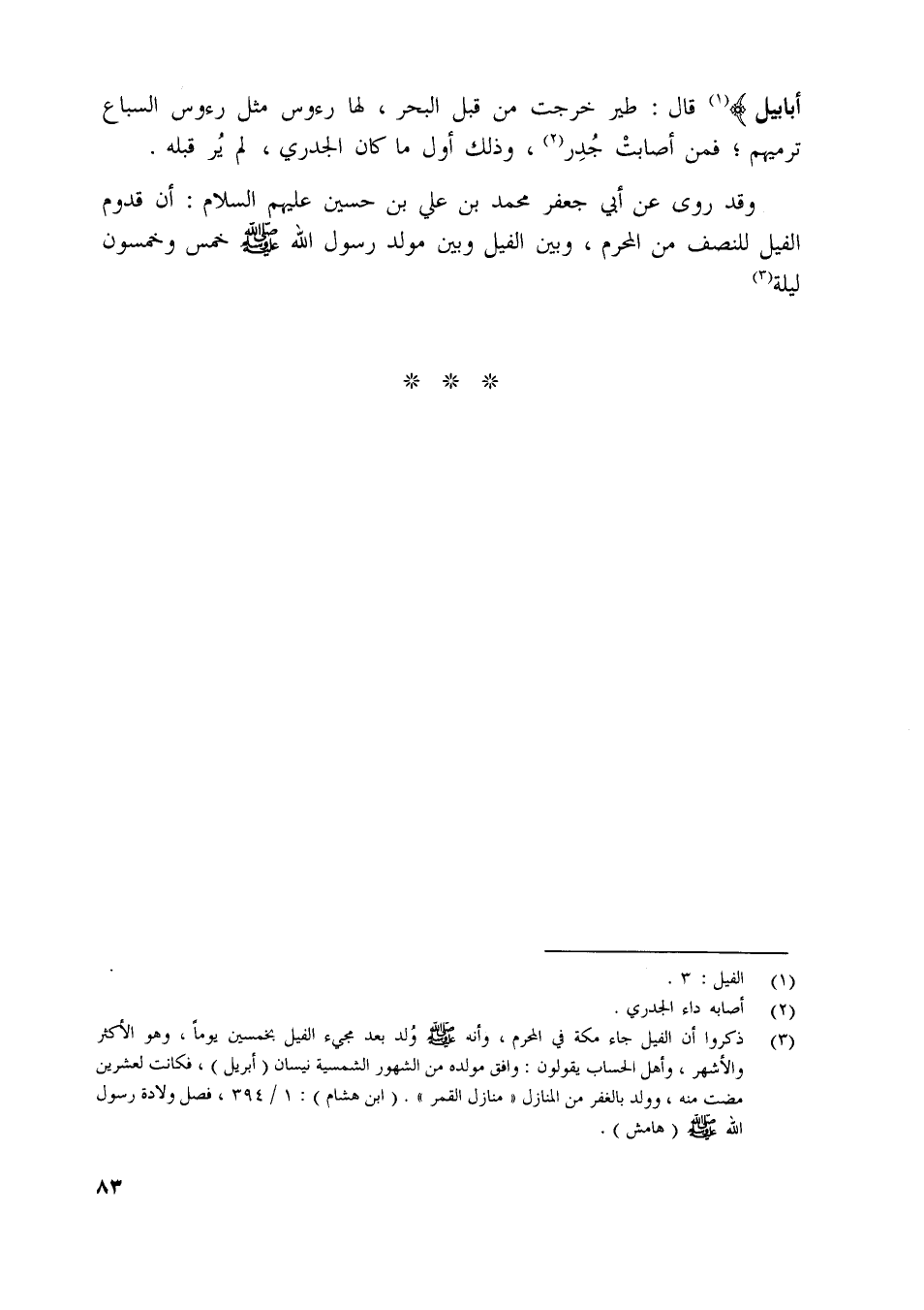 وقد روى عن أبي جعفر محمد بن علي بن حسين عليهم السلام: أن قدوم الفيل للنصف من المحرم، وبين الفيل وبين مولد رسول اللَّه صلّى اللَّه عليه وسلم خمس وخمسون ليلة [ (3) ] .