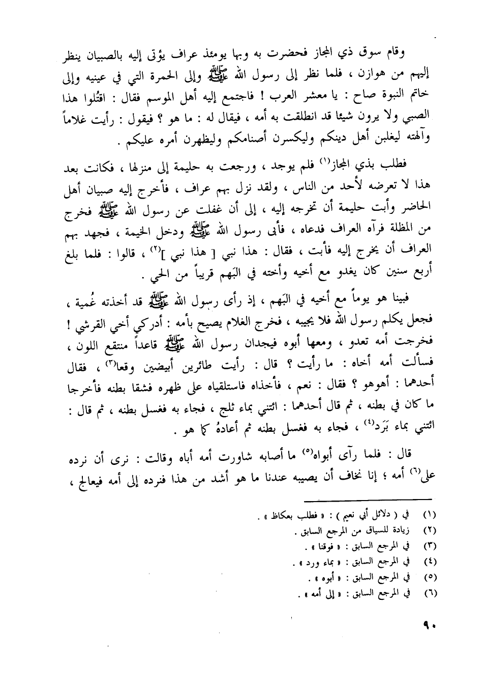 فطلب بذي المجاز [ (1) ] فلم يوجد، ورجعت به حليمة إلى منزلها، فكانت بعد هذا لا تعرضه لأحد من الناس، ولقد نزل بهم عراف، فأخرج إليه صبيان أهل الحاضر وأبت حليمة أن تخرجه إليه، إلى أن غفلت عن رسول اللَّه صلّى اللَّه عليه وسلم فخرج من المظلة فرآه العراف فدعاه، فأبى رسول اللَّه صلّى اللَّه عليه وسلم ودخل الخيمة، فجهد بهم العراف أن يخرج إليه فأبت، فقال: هذا نبي [هذا نبي] [ (2) ] ، قالوا: فلما بلغ أربع سنين كان يغدو مع أخيه وأخته في البهم قريبا من الحي.