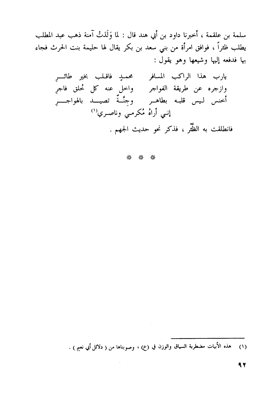 سلمة بن علقمة، أخبرنا داود بن أبي هند قال: لما ولدت آمنة ذهب عبد المطلب يطلب ظئرا، فوافق امرأة من بني سعد بن بكر يقال لها حليمة بنت الحرث فجاء بها فدفعه إليها وشيعها وهو يقول: