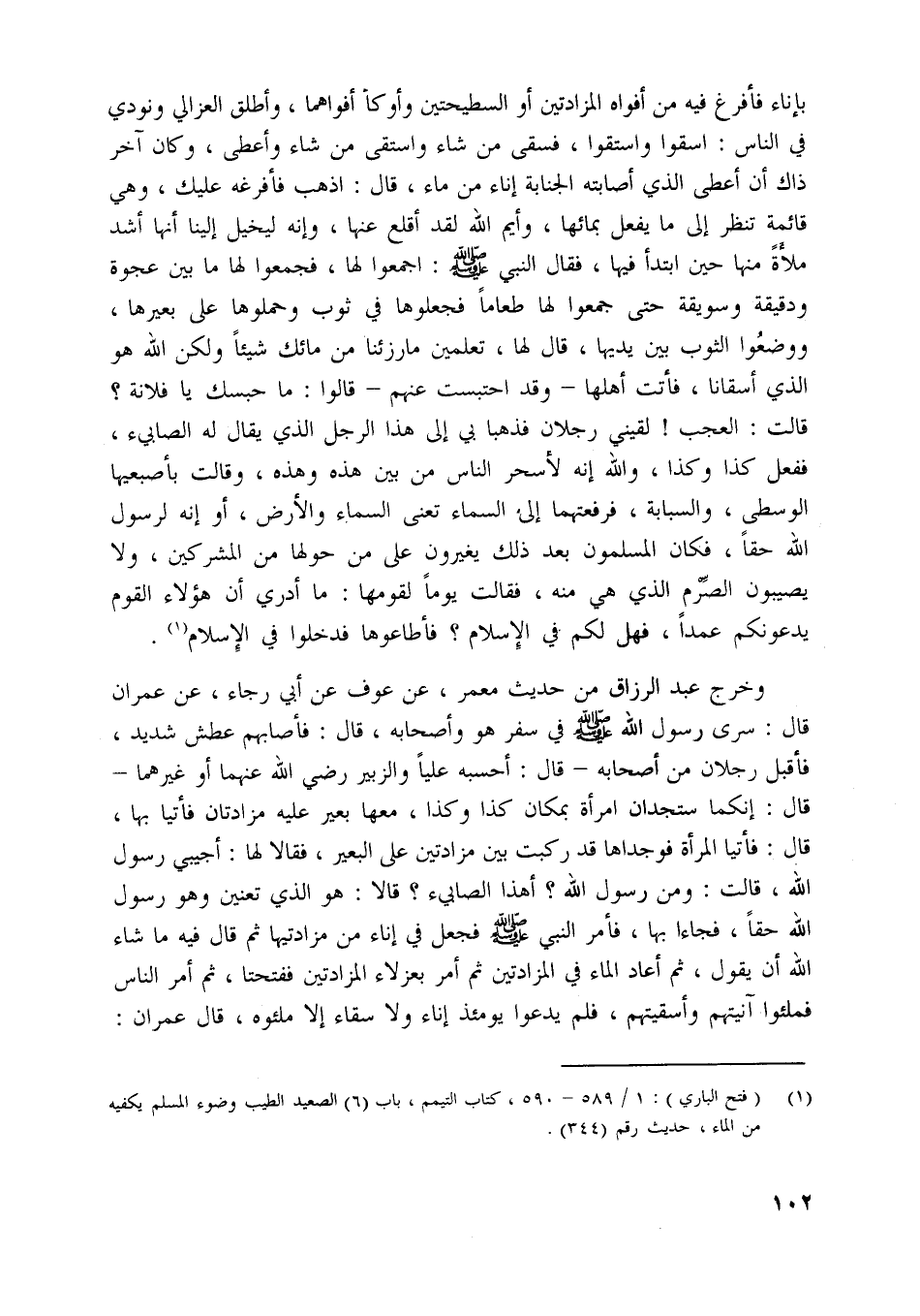 وخرج عبد الرزاق من حديث معمر، عن عوف عن أبي رجاء، عن عمران قال: سرى رسول اللَّه صلّى اللَّه عليه وسلم في سفر هو وأصحابه، قال: فأصابهم عطش شديد، فأقبل رجلان من أصحابه- قال: أحسبه عليا والزبير رضي اللَّه عنهما أو غيرهما- قال: إنكما ستجدان امرأة بمكان كذا وكذا، معها بعير عليه مزادتان فأتيا بها، قال: فأتيا المرأة فوجداها قد ركبت بين مزادتين على البعير، فقالا لها: أجيبي رسول اللَّه، قالت: ومن رسول اللَّه؟ أهذا الصابيء؟ قالا: هو الّذي تعنين وهو رسول اللَّه حقا، فجاءا بها، فأم النبي صلّى اللَّه عليه وسلم فجعل في إناء من مزادتيها ثم قال فيه ما شاء اللَّه أن يقول، ثم أعاد الماء في المزادتين ثم أمر بعزلاء المزادتين ففتحتا، ثم أمر الناس فملئوا آنيتهم وأسقيتهم، فلم يدعوا يومئذ إناء ولا سقاء إلا ملئوه، قال عمران: