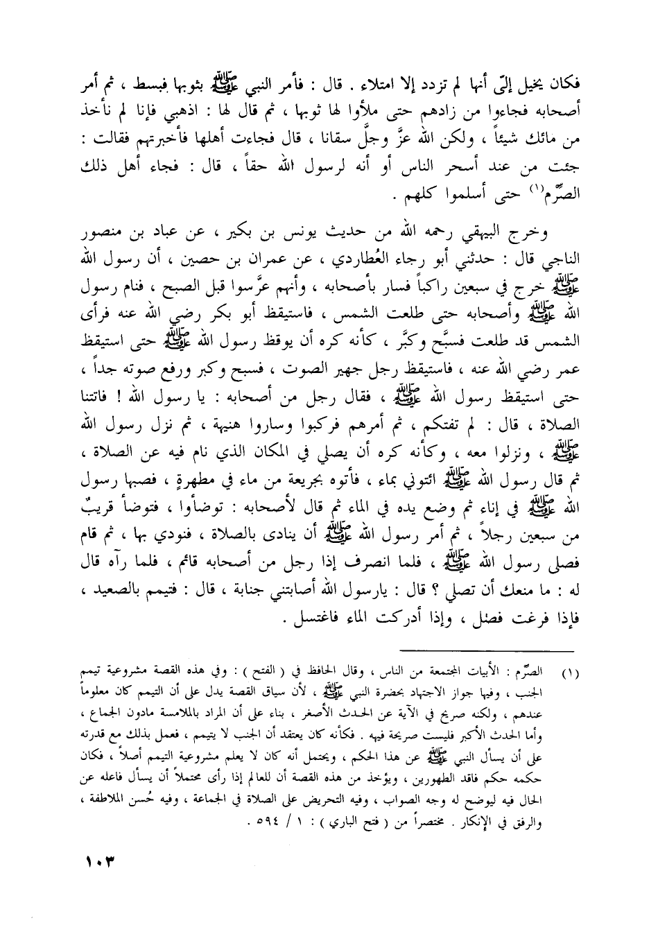 [ (1) ] الصّرم: الأبيات المجتمعة من الناس، وقال الحافظ في (الفتح) : وفي هذه القصة مشروعية تيمم الجنب، وفيها جواز الاجتهاد بحضرة النبي صلّى اللَّه عليه وسلم، لأن سياق القصة يدل على أن التيمم كان معلوما عندهم، ولكنه صريح في الآية عن الحدث الأصغر، بناء على أن المراد بالملامسة ما دون الجماع، وأما الحدث الأكبر فليست صريحة فيه. فكأنه كان يعتقد أن الجنب لا يتيمم، فعمل بذلك مع قدرته على أن يسأل النبي صلّى اللَّه عليه وسلم عن هذا الحكم، ويحتمل أنه كان لا يعلم مشروعية التيمم أصلا، فكان حكمه حكم فاقد الطهورين، ويؤخذ من هذه القصة أن للعالم إذا رأى محتملا أن يسأل فاعله عن الحال فيه ليوضح له وجه الصواب، وفيه التحريض على الصلاة في الجماعة، وفيه حسن الملاطفة، والرّفق في الإنكار. مختصرا من (فتح البخاري) : 1/ 594.