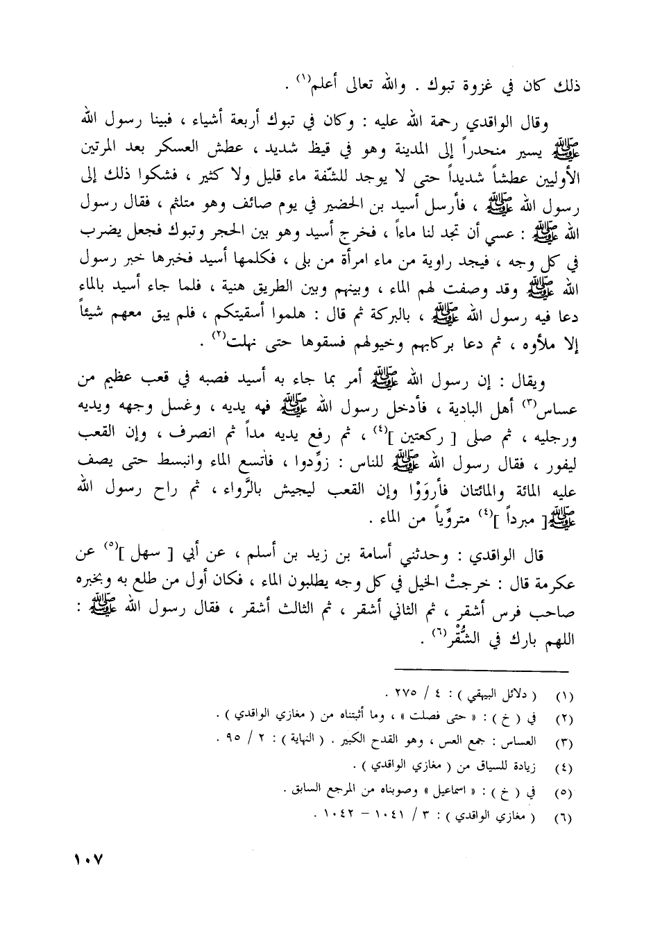 وقال الواقدي رحمة اللَّه عليه: وكان في تبوك أربعة أشياء، فبينا رسول اللَّه صلّى اللَّه عليه وسلم يسير منحدرا إلى المدينة وهو في قيظ شديد، عطش العسكر بعد المرتين الأوليين عطشا شديدا حتى لا يوجد للشّفة ماء قليل ولا كثير، فشكوا ذلك إلى رسول اللَّه صلّى اللَّه عليه وسلم، فأرسل أسيد بن الحضير في يوم صائف وهو متلثم، فقال رسول اللَّه صلّى اللَّه عليه وسلم: عسي أن تجد لنا ماء، فخرج أسيد وهو بين الحجر وتبوك فجعل يضرب في كل وجه، فيجد راوية من ماء امرأة من بلى، فكلمها أسيد فخبرها خبر رسول اللَّه صلّى اللَّه عليه وسلم وقد وصفت لهم الماء، وبينهم وبين الطريق هنية، فلما جاء أسيد بالماء دعا فيه رسول اللَّه صلّى اللَّه عليه وسلم، بالبركة ثم قال: هلموا أسقيتكم، فلم يبق معهم شيئا إلا ملئوه، ثم دعا بركابهم وخيولهم فسقوها حتى نهلت [ (2) ] .