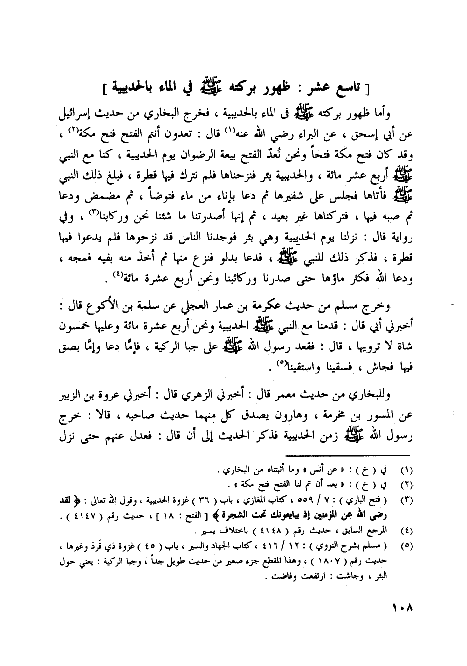 وأما ظهور بركته صلّى اللَّه عليه وسلم في الماء بالحديبية، فخرج البخاري من حديث إسرائيل عن أبي إسحاق، عن البراء رضي اللَّه عنه [ (1) ] قال: تعدون أنتم الفتح فتح مكة [ (2) ] ، وقد كان فتح مكة فتحا ونحن نعدّ الفتح بيعة الرضوان يوم الحديبيّة، كنا مع النبي صلّى اللَّه عليه وسلم أربع عشر مائة، والحديبيّة بئر فنزحناها فلم نترك فيها قطرة، فبلغ ذلك النبي صلّى اللَّه عليه وسلم فأتاها فجلس على شفيرها ثم دعا بإناء من ماء فتوضأ، ثم مضمض ودعا ثم صبه فيها، فتركناها غير بعيد، ثم إنها أصدرتنا ما شئنا نحن وركابنا [ (3) ] ، وفي رواية قال: نزلنا يوم الحديبيّة وهي بئر فوجدنا الناس قد نزحوها فلم يدعوا فيها قطرة، فذكر ذلك للنّبيّ صلّى اللَّه عليه وسلم، فدعا بدلو فنزع منها ثم أخذ منه بفيه فمجه، ودعا اللَّه فكثر ماؤها حتى صدرنا وركائبنا ونحن أربع عشرة مائة [ (4) ] .