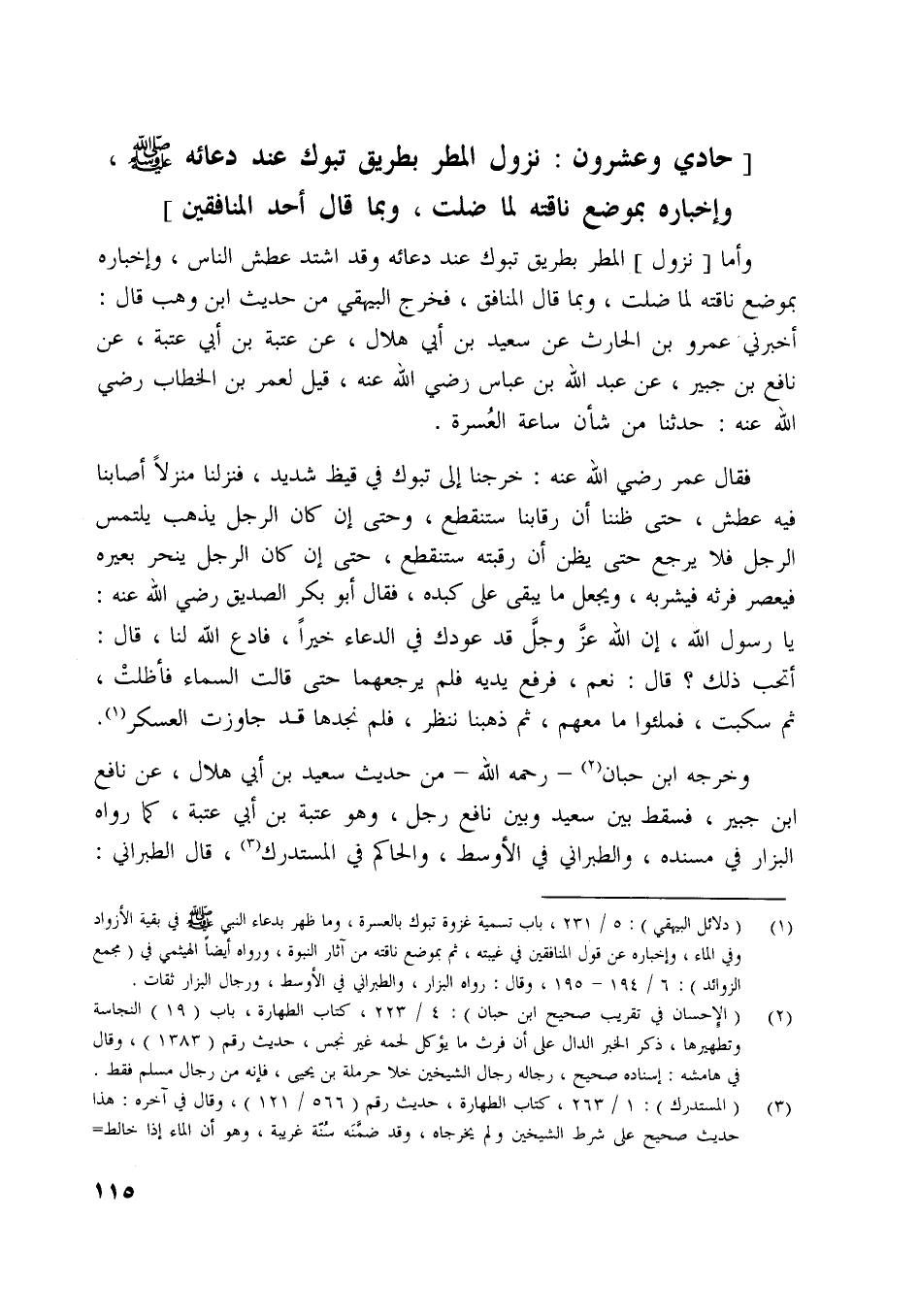 [ (1) ] (دلائل البيهقي) : 5/ 231، باب تسمية غزوة تبوك بالعسرة، وما ظهر بدعاء النبي صلّى اللَّه عليه وسلم في بقية الأزواد وفي الماء، وإخباره عن قول المنافقين في غيبته، ثم بموضع ناقته من آثار النبوة، ورواه أيضا الهيثمي في (مجمع الزوائد) : 6/ 194- 195، وقال: رواه البزار، والطبراني في الأوسط، ورجال البزار ثقات.