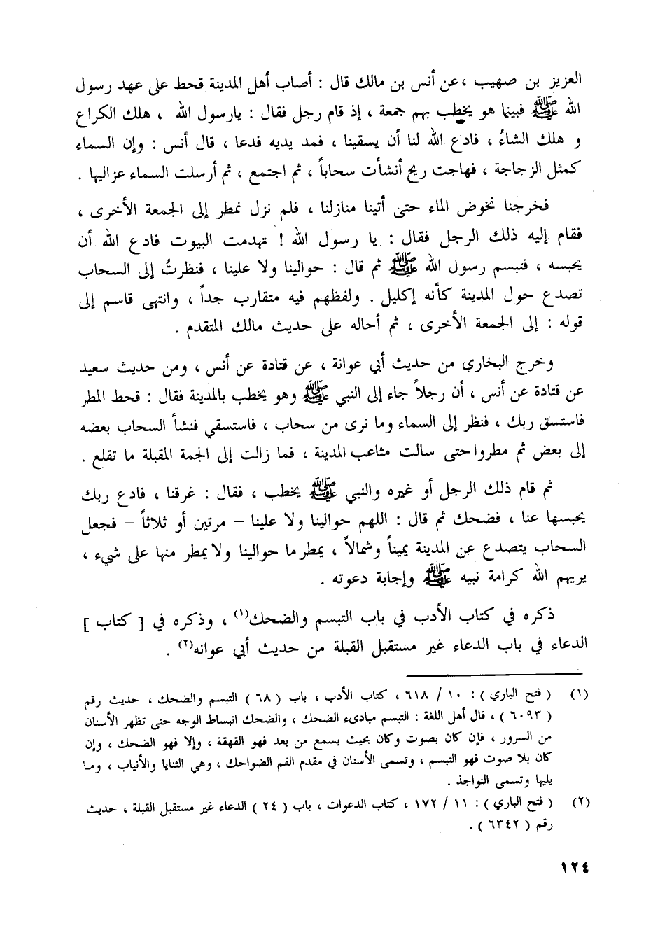 العزيز بن صهيب، عن أنس بن مالك قال: أصاب أهل المدينة قحط على عهد رسول اللَّه صلّى اللَّه عليه وسلم فبينما هو يخطب بهم جمعة، إذ قام رجل فقال: يا رسول اللَّه، هلك الكراع وهلك الشاء، فادع اللَّه لنا أن يسقينا، فمد يديه فدعا، قال أنس: وإن السماء كمثل الزجاجة، فهاجت ريح أنشأت سحابا، ثم اجتمع، ثم أرسلت السماء عز اليها.