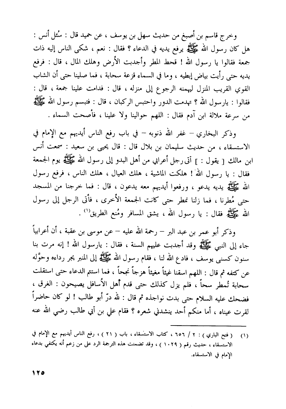 [ (1) ] (فتح الباري) : 2/ 656، كتاب الاستسقاء، باب (21) ، رفع الناس أيديهم مع الإمام في الاستسقاء، حديث رقم (1029) ، وقد تضمنت هذه الترجمة الرد على من زعم أنه يكتفي بدعاء الإمام في الاستسقاء.