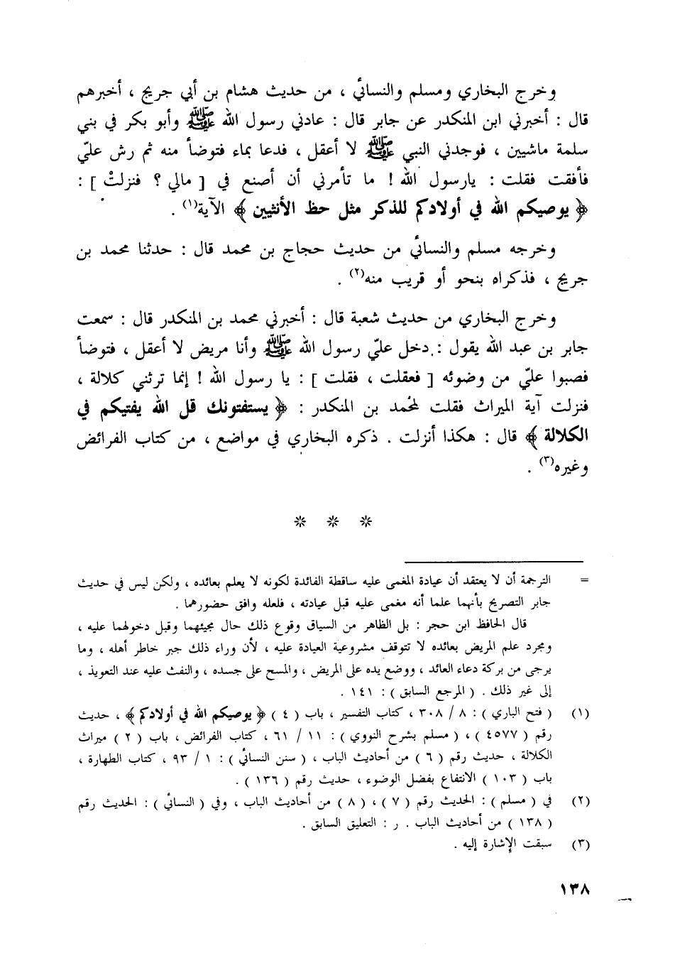 [ (1) ] (فتح الباري) : 8/ 308، كتاب التفسير، باب (4) يُوصِيكُمُ اللَّهُ فِي أَوْلادِكُمْ، حديث رقم (4577) ، (مسلم بشرح النووي) : 11/ 61، كتاب الفرائض، باب (2) ميراث الكلالة، حديث رقم (6) من أحاديث الباب، (سنن النسائي) : 1/ 93، كتاب الطهارة، باب (103) الانتفاع بفضل الوضوء، حديث رقم (136) .