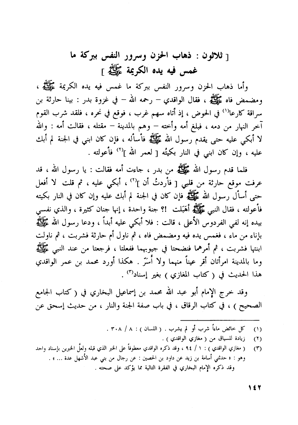 وأما ذهاب الحزن وسرور النفس ببركة ما غمس فيه يده الكريمة صلّى اللَّه عليه وسلم، ومضمض فاه صلّى اللَّه عليه وسلم، فقال الواقدي- رحمه اللَّه- في غزوة بدر: بينا حارثة بن سراقة كارعا [ (1) ] في الحوض، إذ أتاه سهم غرب، فوقع في نحره، فلقد شرب القوم آخر النهار من دمه، فبلغ أمه وأخته- وهم بالمدينة- مقتله، فقالت أمه: واللَّه لا أبكي عليه حتى يقدم رسول اللَّه صلّى اللَّه عليه وسلم فأسأله، فإن كان ابني في الجنة لم أبك عليه، وإن كان ابني في النار بكيته [لعمر اللَّه] [ (2) ] فأعولته.