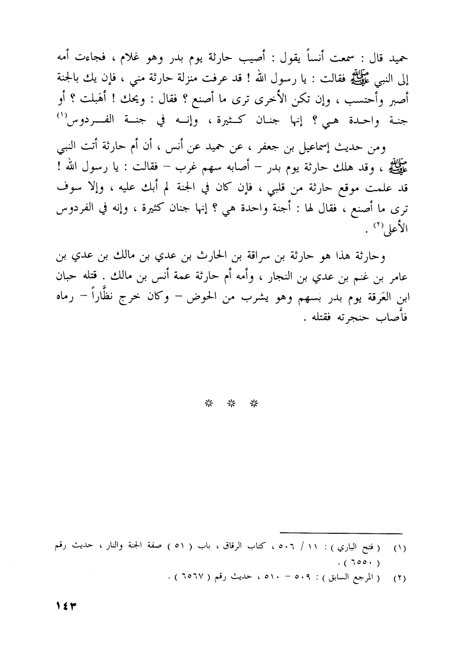ومن حديث إسماعيل بن جعفر، عن حميد عن أنس، أن أم حارثة أتت النبي صلّى اللَّه عليه وسلم، وقد هلك حارثة يوم بدر- أصابه سهم غرب- فقالت: يا رسول اللَّه! قد علمت موقع حارثة من قلبي، فإن كان في الجنة لم أبك عليه، وإلا سوف ترى ما أصنع، فقال لها: أجنة واحدة هي؟ إنها جنان كثيرة، وإنه في الفردوس الأعلى [ (2) ] .