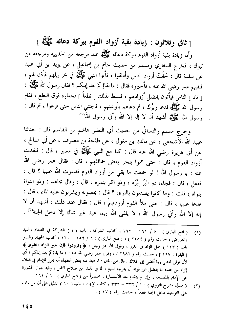 وأما زيادة بقية أزواد القوم ببركة دعائه صلّى اللَّه عليه وسلم عند مرجعه من الحديبيّة ومرجعه من تبوك،