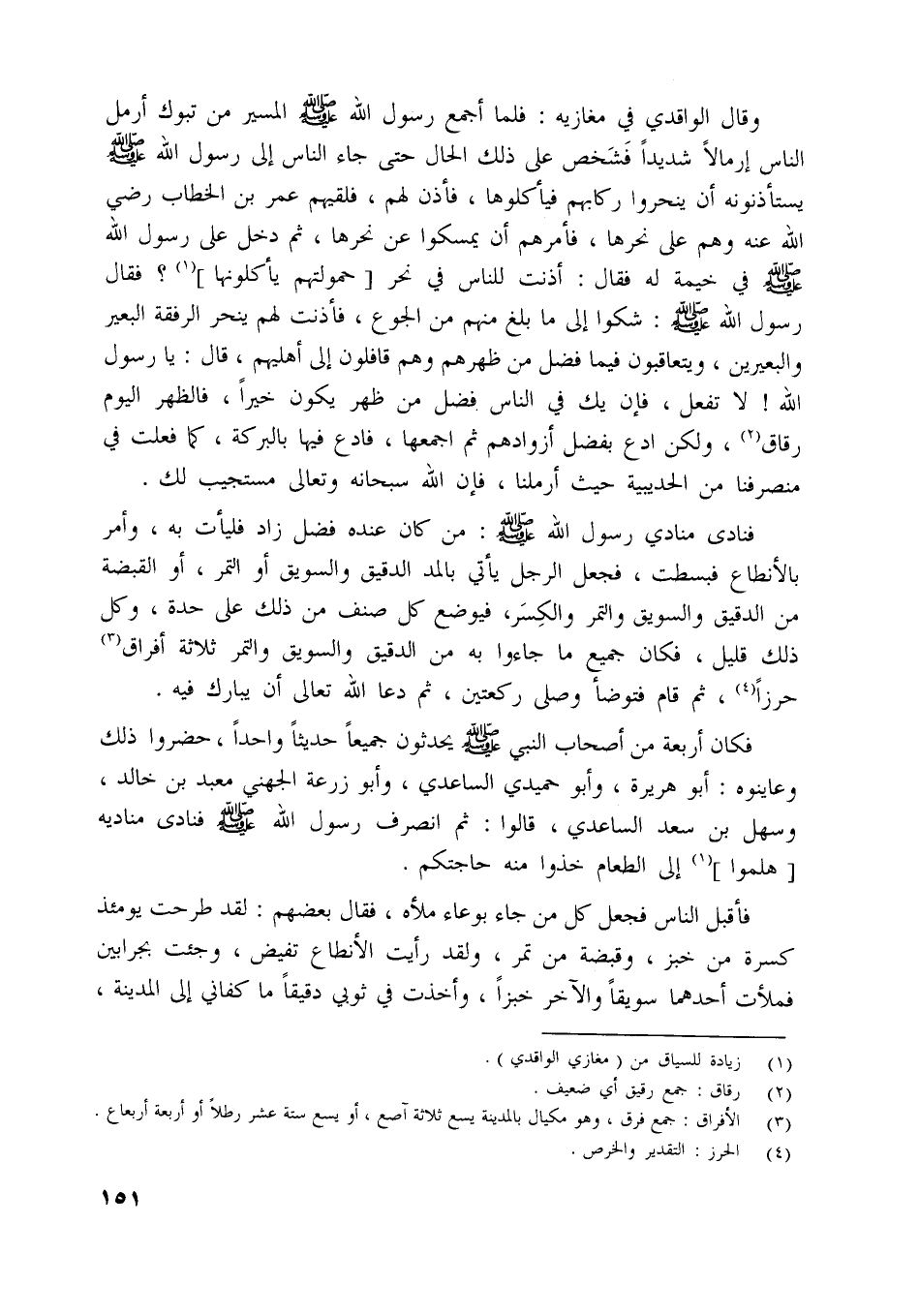 وقال الواقدي في مغازيه: فلما أجمع رسول اللَّه صلّى اللَّه عليه وسلم المسير من تبوك أرمل الناس إرمالا شديدا فشخص على ذلك الحال حتى جاء الناس إلى رسول اللَّه صلّى اللَّه عليه وسلم يستأذنونه أن ينحروا ركابهم فيأكلوها، فأذن لهم، فلقيهم عمر بن الخطاب رضي اللَّه عنه وهم على نحرها، فأمرهم أن يمسكوا عن نحرها، ثم دخل على رسول اللَّه صلّى اللَّه عليه وسلم في خيمة له فقال: أذنت للناس في نحر [حمولتهم يأكلونها] [ (1) ] ؟ فقال رسول اللَّه صلّى اللَّه عليه وسلم: شكوا إلى ما بلغ منهم من الجوع، فأذنت لهم ينحر الرفقة البعير والبعيرين، ويتعاقبون فيما فضل من ظهرهم وهم قافلون إلى أهليهم،