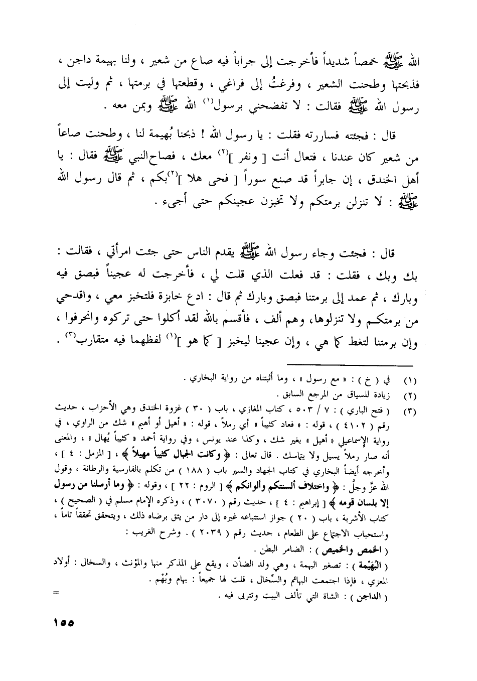 اللَّه صلّى اللَّه عليه وسلم خمصا شديدا فأخرجت إلى جرابا فيه صاع من شعير، ولنا بهيمة داجن، فذبحتها وطحنت الشعير، وفرغت إلى فراغي، وقطعتها في برمتها، ثم وليت إلى رسول اللَّه صلّى اللَّه عليه وسلم فقالت: لا تفضحني برسول [ (1) ] اللَّه صلّى اللَّه عليه وسلم وبمن معه.