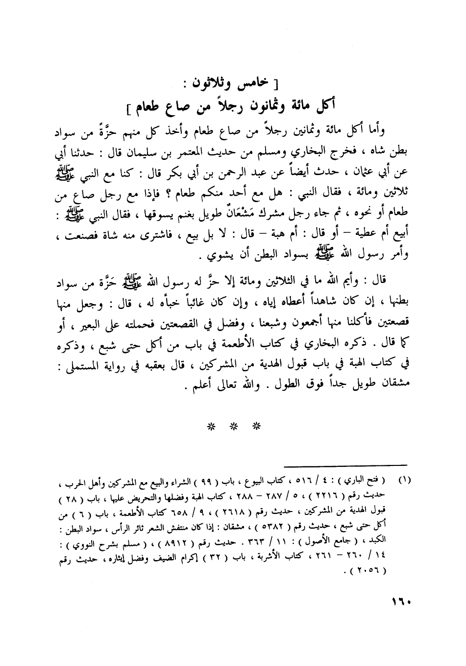 قال: وأيم اللَّه ما في الثلاثين ومائة إلا حزّ له رسول اللَّه صلّى اللَّه عليه وسلم حزّة من سواد بطنها، إن كان شاهدا أعطاه إياه، وإن كان غائبا خبأه له، قال: وجعل منها قصعتين فأكلنا منها أجمعون وشبعنا، وفضل في القصعتين فحملته على البعير، أو كما قال. ذكره البخاري في كتاب الأطعمة في باب من أكل حتى شبع، وذكره في كتاب الهبة في باب قبول الهدية من المشركين، قال بعقبه في رواية المستملي: