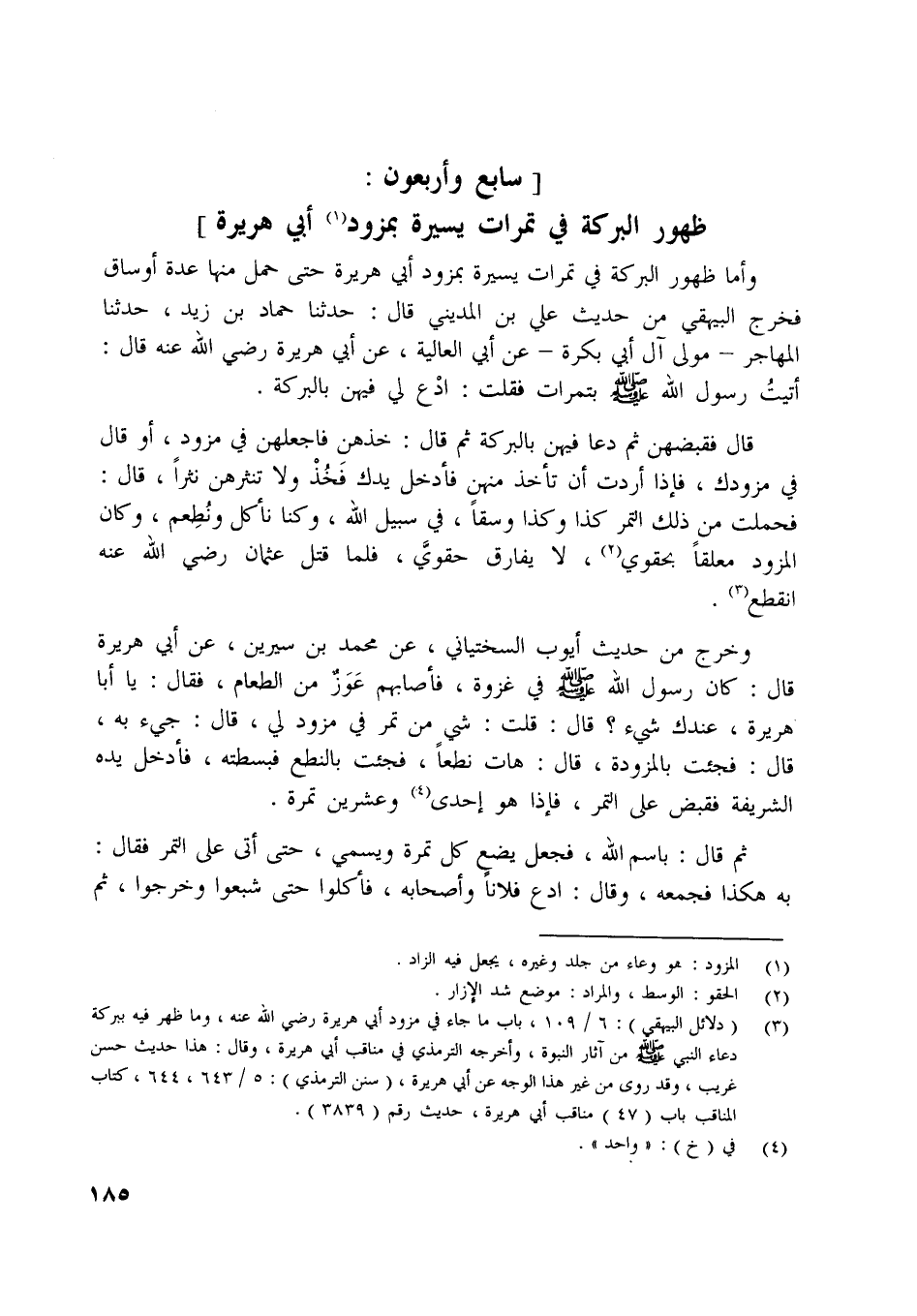 [ (3) ] (دلائل البيهقي) : 6/ 109، باب ما جاء في مزود أبي هريرة رضي اللَّه عنه، وما ظهر فيه ببركة دعاء النبي صلّى اللَّه عليه وسلم من آثار النبوة، وأخرجه الترمذي في مناقب أبي هريرة، وقال: هذا حديث حسن غريب، وقد روى من غير هذا الوجه عن أبي هريرة، (سنن الترمذي) : 5/ 643، 644، كتاب المناقب باب (47) مناقب أبي هريرة، حديث رقم (3839) .