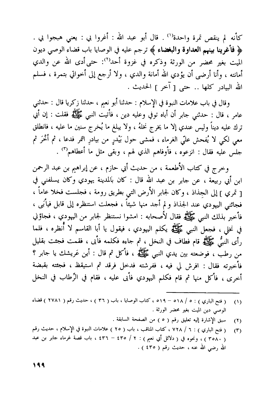 وقال في باب علامات النبوة في الإسلام: حدثنا أبو نعيم، حدثنا زكريا قال: حدثني عامر، قال: حدثني جابر أن أباه توفي وعليه دين، فأتيت النبي صلّى اللَّه عليه وسلم فقلت: إن أبي ترك عليه دينا وليس عندي إلا ما يخرج نخله، ولا يبلغ ما يخرج سنين ما عليه، فانطلق معي لكي لا يفحش عليّ الغرماء، فمشى حول بيدر من بيادر التمر فدعا، ثم أخّر ثم جلس عليه فقال: انزعوه، فأوفاهم الّذي لهم، وبقي مثل ما أعطاهم [ (3) ] .