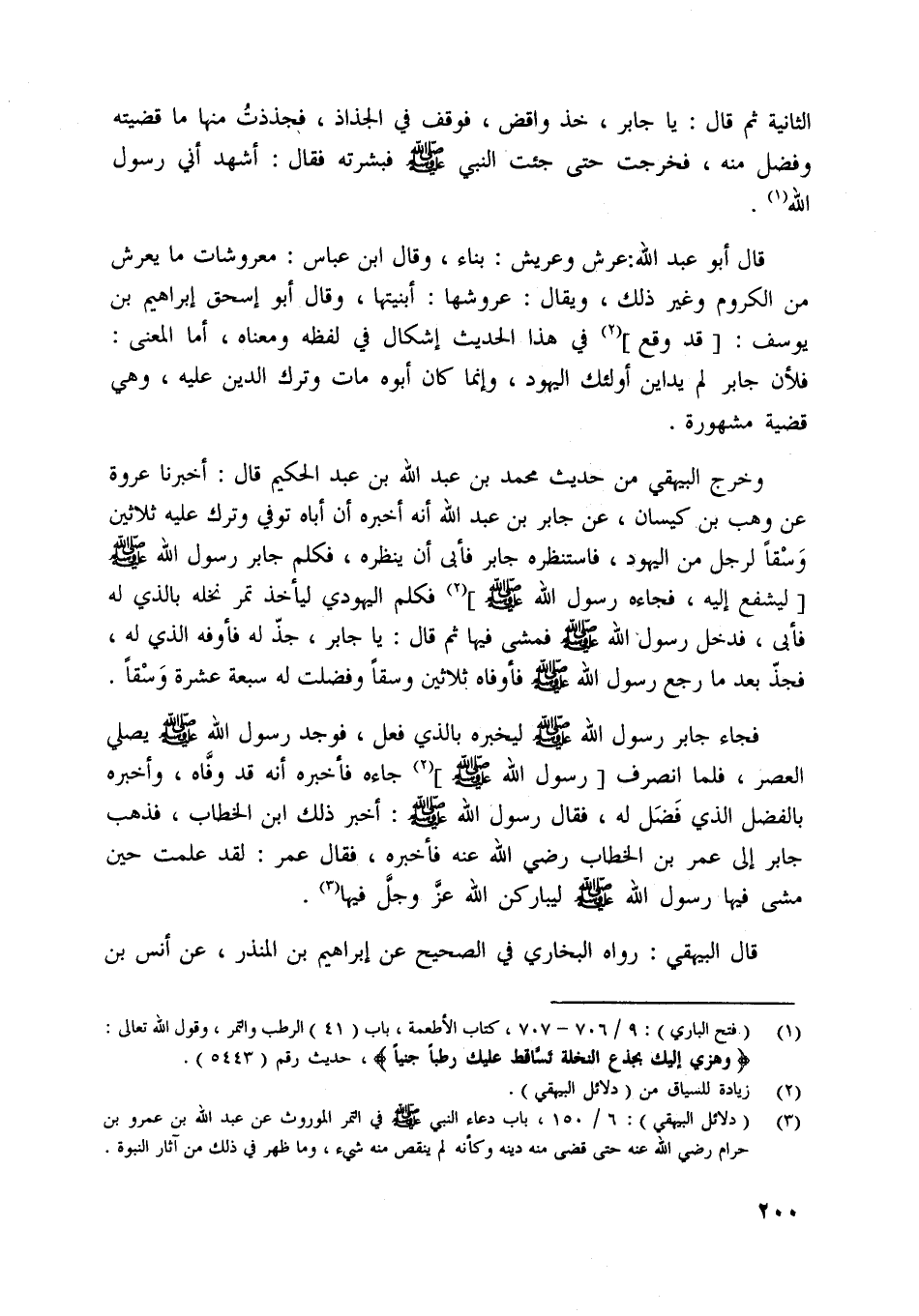 [ (3) ] (دلائل البيهقي) : 6/ 150، باب دعاء النبي صلّى اللَّه عليه وسلم في التمر الموروث عن عبد اللَّه بن عمرو بن حرام رضي اللَّه عنه حتى قضى منه دينه وكأنه لم ينقص منه شيء، وما ظهر في ذلك من آثار النبوة.