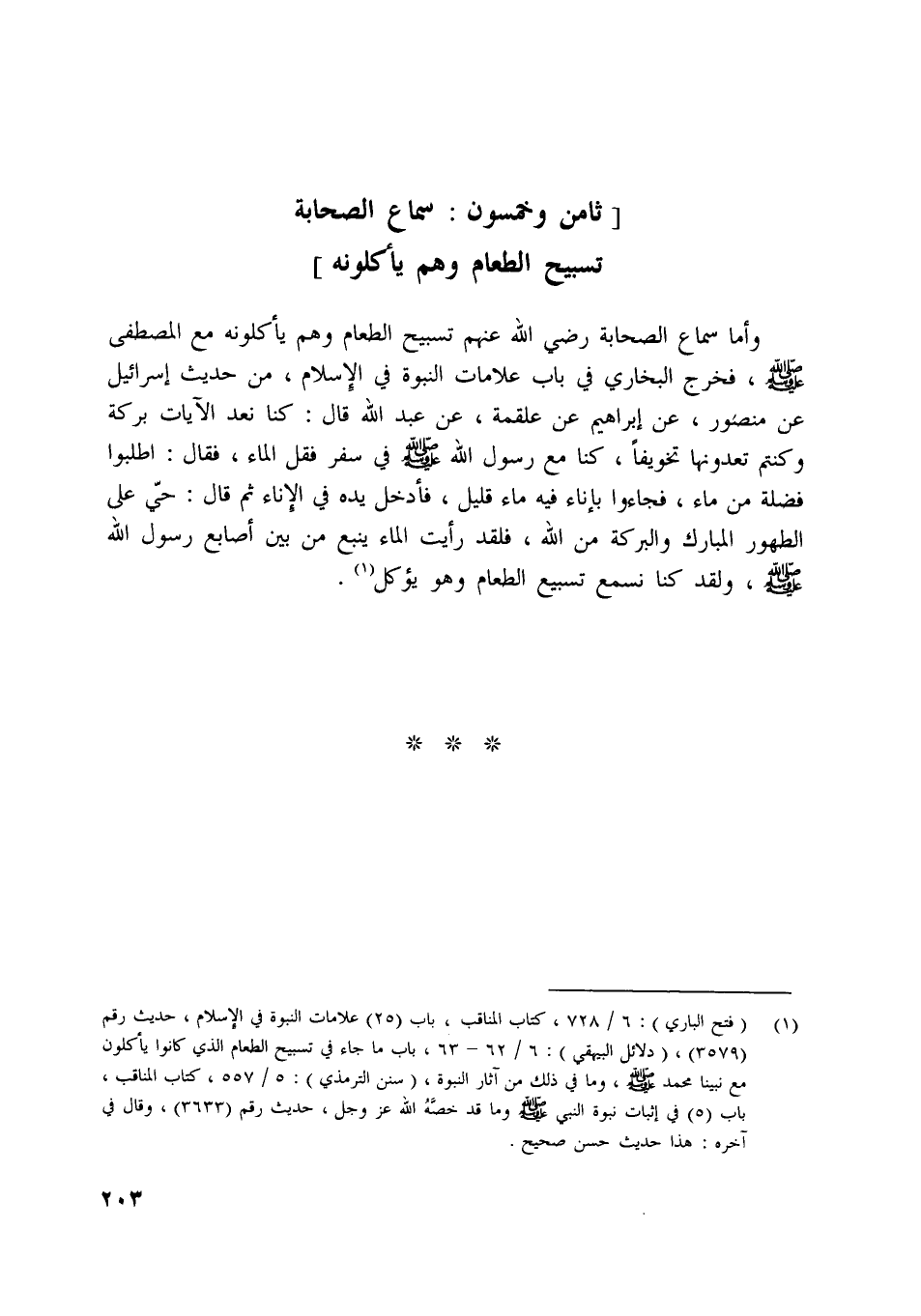 [ (1) ] (فتح الباري) : 6/ 728، كتاب المناقب، باب (25) علامات النبوة في الإسلام، حديث رقم (3579) ، (دلائل البيهقي) : 6/ 62- 63، باب ما جاء في تسبيح الطعام الّذي كانوا يأكلون مع نبينا محمد صلّى اللَّه عليه وسلم، وما في ذلك من آثار النبوة، (سنن الترمذي) : 5/ 557، كتاب المناقب، باب (5) في إثبات نبوة النبي صلّى اللَّه عليه وسلم وما قد خصّه اللَّه عز وجل، حديث رقم (3633) ، وقال في آخره: هذا حديث حسن صحيح.