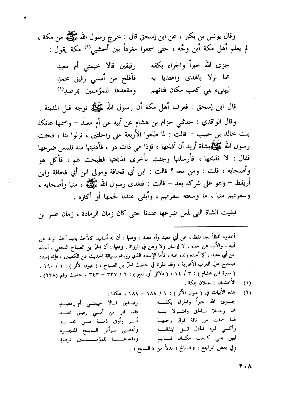 [ () ] أخذوه لفظا بعد لفظ، عن أبي معبد وأم معبد، ومنها: أن له أسانيد كالأخذ باليد أخذ الولد عن أبيه، والأب عن جده، لا إرسال ولا وهن في الرواة. ومنها: أن الحرّ بن الصباح النخعي، أخذه عن أبي معبد، كما أخذه ولده عنه، فأما الإسناد الّذي رويناه بسياقة الحديث عن الكعبيين، فإنه إسناد صحيح عال للعرب الأعاربة، وقد علونا في حديث الحرّ بن الصباح، (عيون الأثر) : 1/ 190، (سيرة ابن هشام) : 3/ 14، (دلائل أبي نعيم) : 2/ 337- 343، حديث رقم (238) .