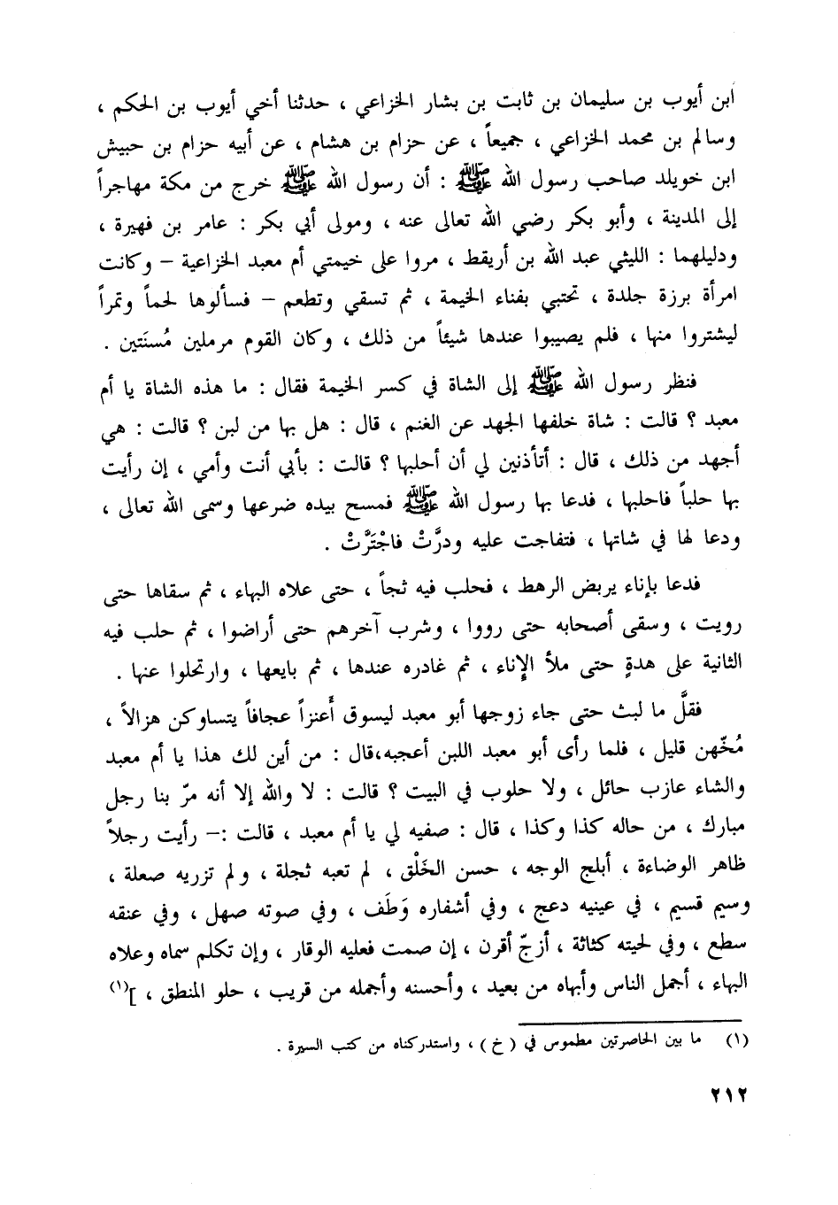 فقلّ ما لبث حتى جاء زوجها أبو معبد ليسوق أعنزا عجافا يتساوكن هزالا، مخّهن قليل، فلما رأى أبو معبد اللبن أعجبه، قال: من أين لك هذا يا أم معبد والشاء عازب حائل، ولا حلوب في البيت؟ قالت: لا واللَّه إلا أنه مرّ بنا رجل مبارك، من حاله كذا وكذا، قال: صفيه لي يا أم معبد، قالت: - رأيت رجلا ظاهر الوضاءة، أبلج الوجه، حسن الخلق، لم تعبه ثجلة، ولم تزريه صعلة، وسيم قسيم، في عينيه دعج، وفي أشفاره وطف، وفي صوته صهل، وفي عنقه سطع، وفي لحيته كثاثة، أزجّ أقرن، إن صمت فعليه الوقار، وإن تكلم سماه وعلاه البهاء، أجمل الناس وأبهاه من بعيد، وأحسنه وأجمله من قريب، حلو المنطق،] [ (1) ]