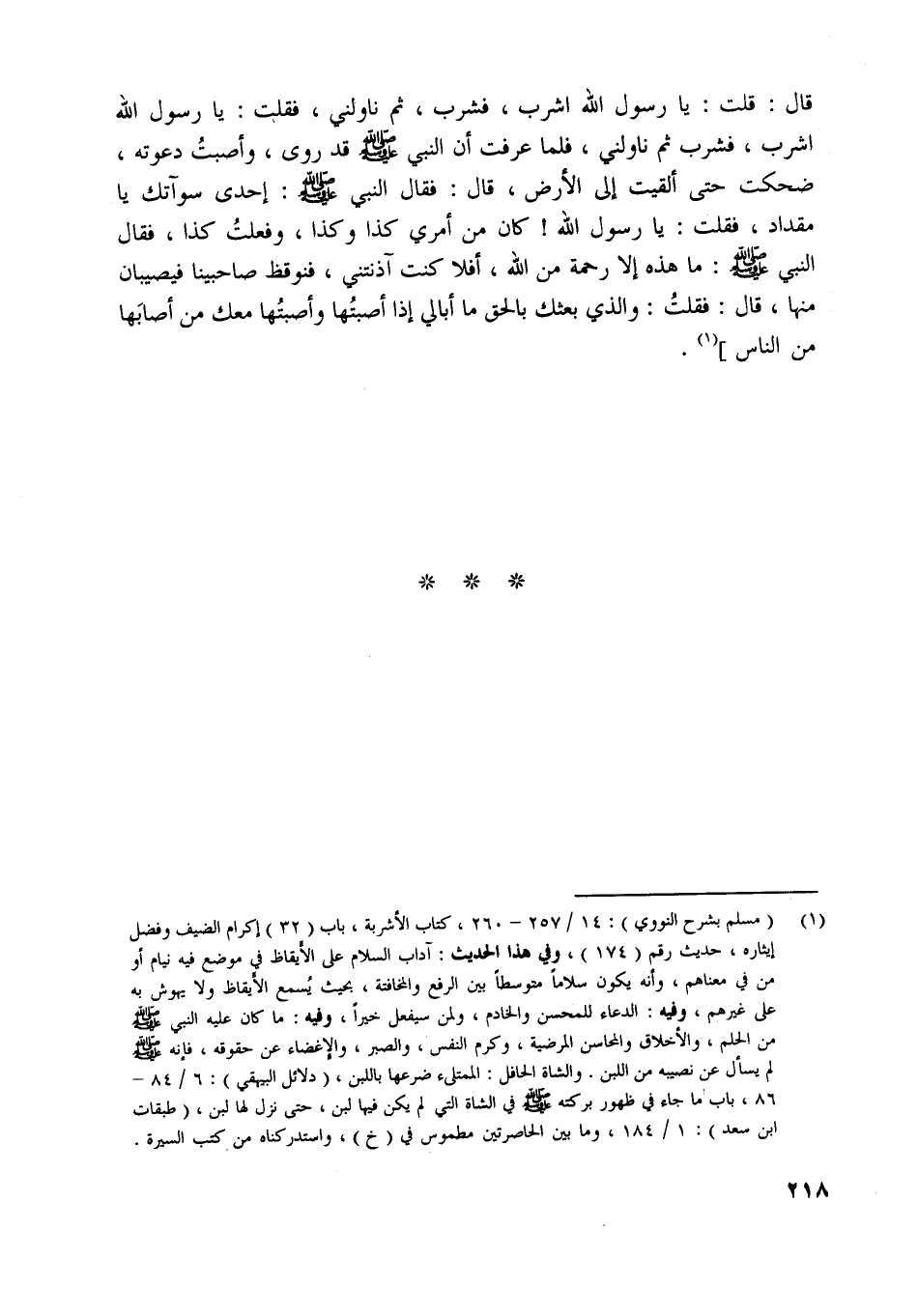 قال: قلت: يا رسول اللَّه اشرب، فشرب، ثم ناولني، فقلت: يا رسول اللَّه اشرب، فشرب ثم ناولني، فلما عرفت أن النبي صلّى اللَّه عليه وسلّم قد روى، وأصبت دعوته، ضحكت حتى ألقيت إلى الأرض، قال: فقال النبي صلّى اللَّه عليه وسلّم: إحدى سوءاتك يا مقداد، فقلت: يا رسول اللَّه! كان من أمري كذا وكذا، وفعلت كذا، فقال النبي صلّى اللَّه عليه وسلّم: ما هذه إلا رحمة من اللَّه، أفلا كنت آذنتني، فنوقظ صاحبينا فيصيبان منها، قال: فقلت: والّذي بعثك بالحق ما أبالي إذا أصبتها وأصبتها معك من أصابها من الناس] [ (1) ] .