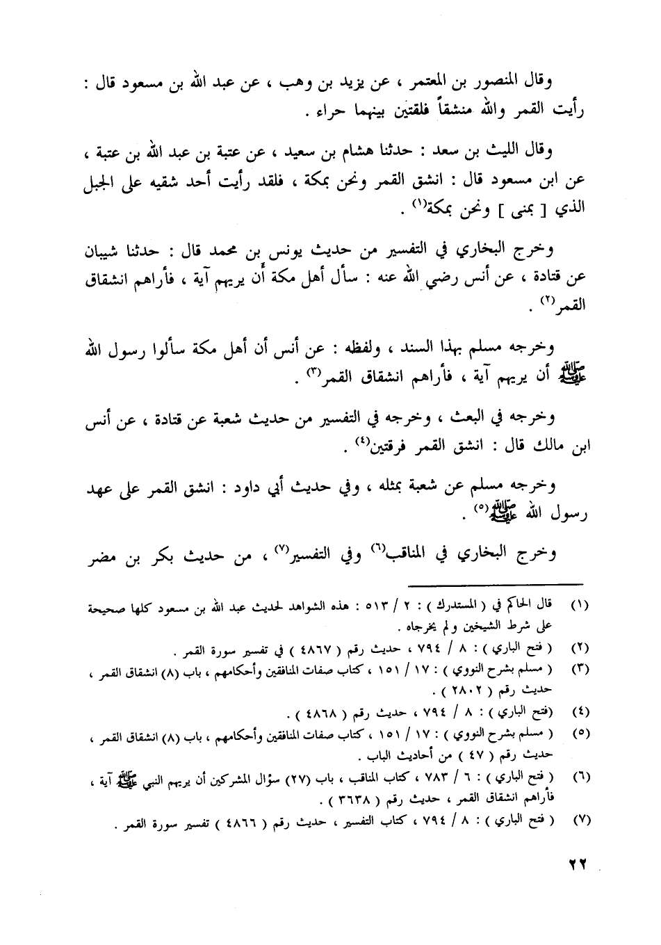 [ (6) ] (فتح الباري) : 6/ 783، كتاب المناقب، باب (27) سؤال المشركين أن يريهم النبي صلّى اللَّه عليه وسلم آية، فأراهم انشقاق القمر، حديث رقم (3638) .
