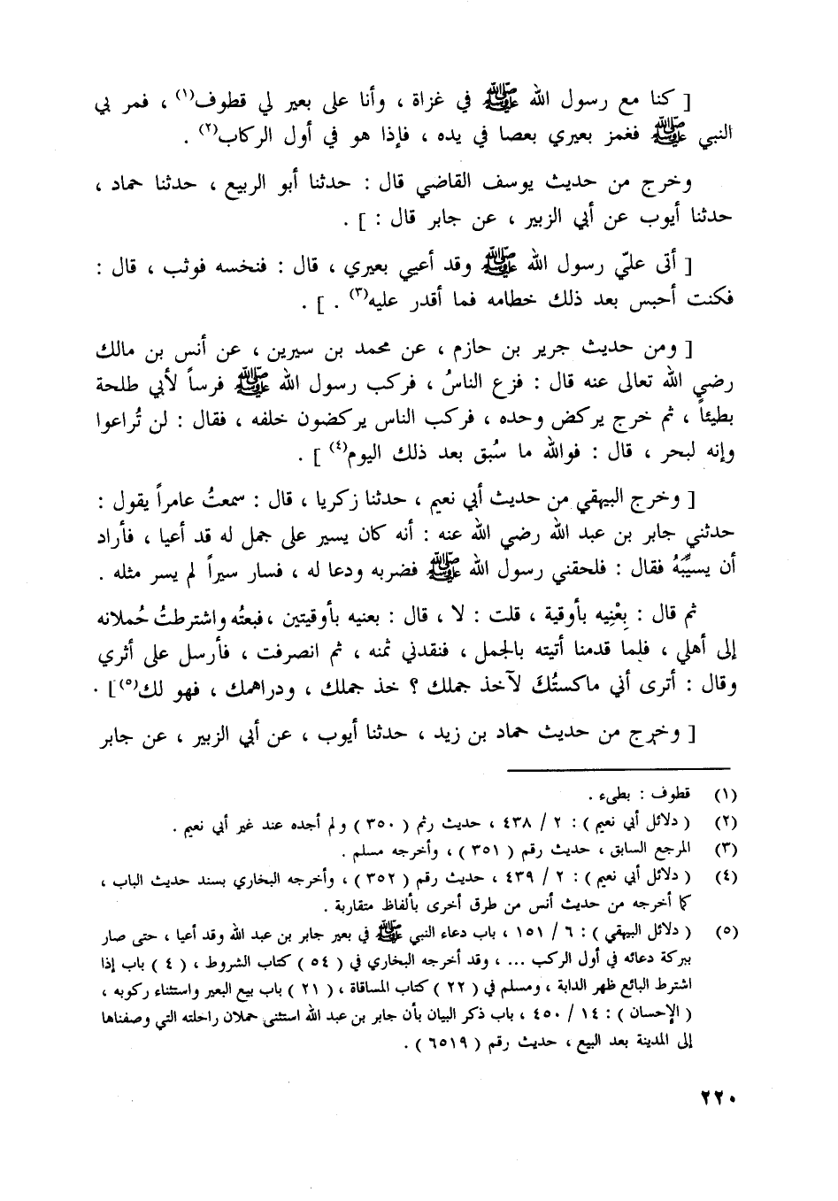[ (5) ] (دلائل البيهقي) : 6/ 151، باب دعاء النبي صلّى اللَّه عليه وسلّم في بعير جابر بن عبد اللَّه وقد أعيا، حتى صار ببركة دعائه في أول الركب ... ، وقد أخرجه البخاري في (54) كتاب الشروط، (4) باب إذا اشترط البائع ظهر الدابة، ومسلم في (22) كتاب المساقاة، (21) باب بيع البعير واستثناء ركوبه، (الإحسان) : 14/ 450، باب ذكر البيان بأن جابر بن عبد اللَّه استثنى حملان راحلته التي وصفناها إلى المدينة بعد البيع، حديث رقم (6519) .