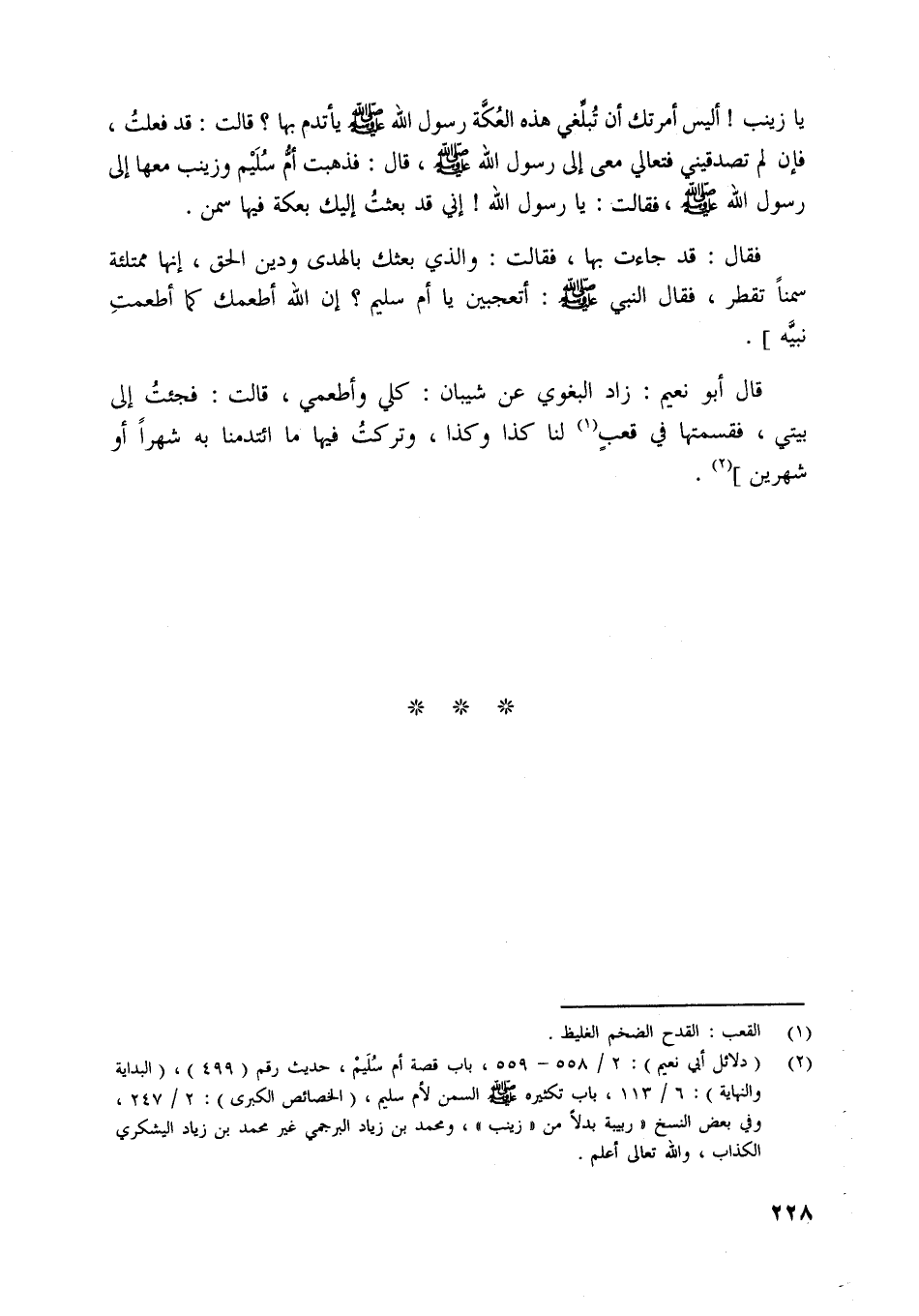 [ (2) ] (دلائل أبي نعيم) : 2/ 558- 559، باب قصة أم سليم، حديث رقم (499) ، (البداية والنهاية) : 6/ 113، باب تكثيره صلّى اللَّه عليه وسلّم السمن لأم سليم، (الخصائص الكبرى) : 2/ 247، وفي بعض النسخ «ربيبة بدلا من «زينب» ، ومحمد بن زياد البرجمي غير محمد بن زياد اليشكري الكذاب، واللَّه تعالى أعلم.