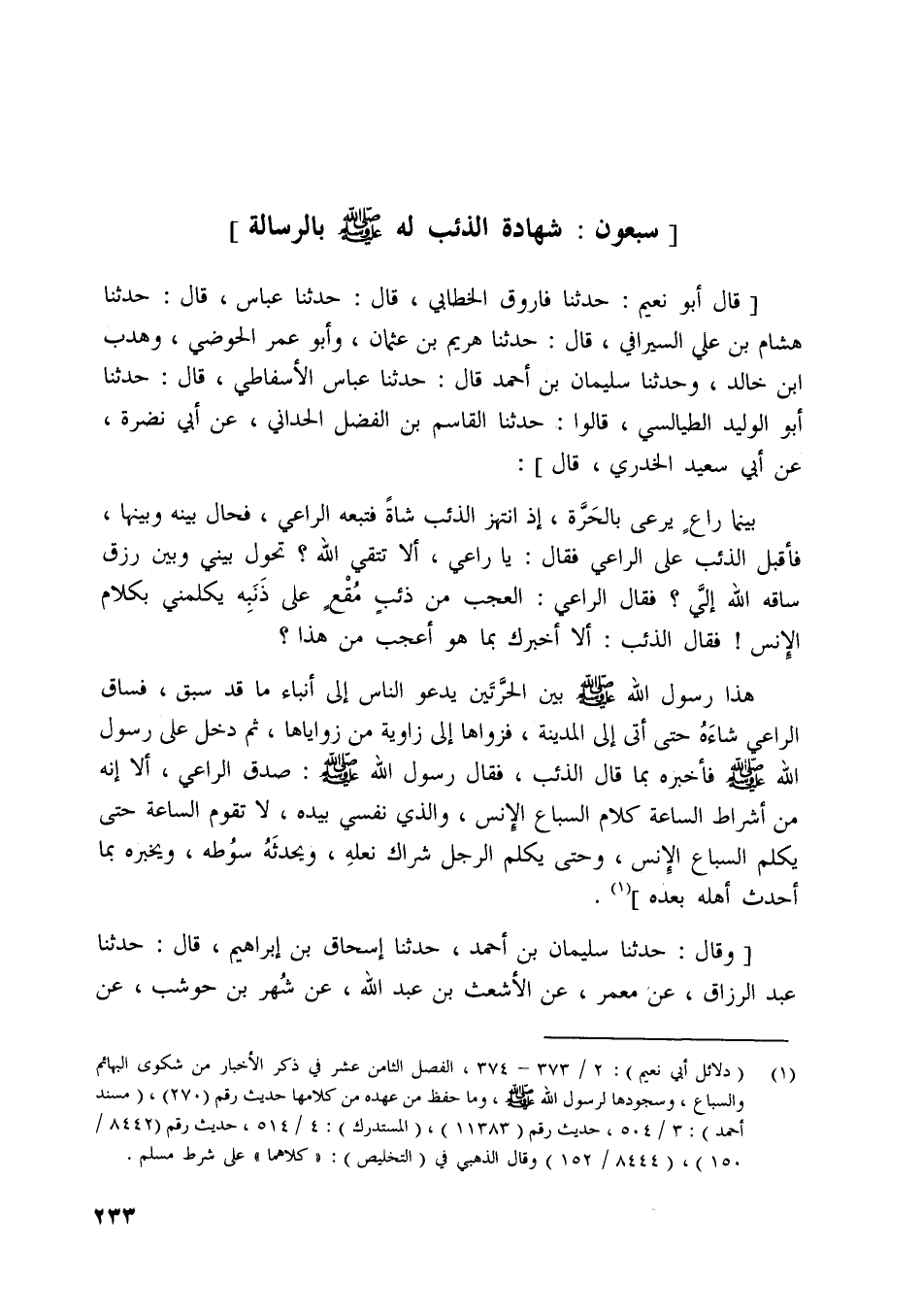 [ (1) ] (دلائل أبي نعيم) : 2/ 373- 374، الفصل الثامن عشر في ذكر الأخبار من شكوى البهائم والسباع، وسجودها لرسول اللَّه صلّى اللَّه عليه وسلّم، وما حفظ من عهده من كلامها حديث رقم (270) ، (مسند أحمد) : 3/ 504، حديث رقم (11383) ، (المستدرك) : 4/ 514، حديث رقم (8442/ 150) ، (8444/ 152) وقال الذهبي في (التخليص) : «كلاهما» على شرط مسلم.
